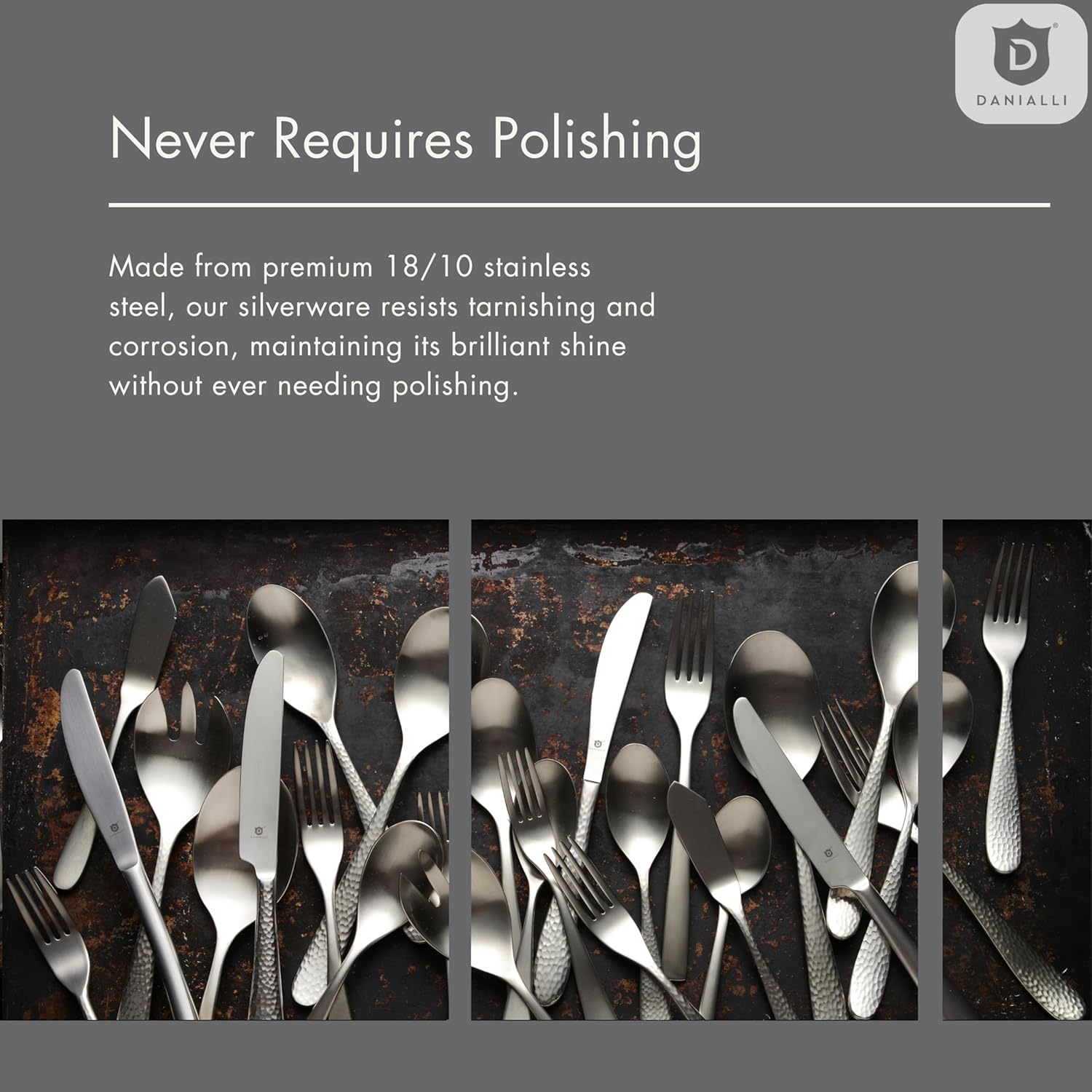 - The Heaviest in DANIALLI’s Collection – Crafted from solid 18/10 stainless steel, each piece is designed with a hefty, well-balanced grip that adds substance and elegance to every meal.