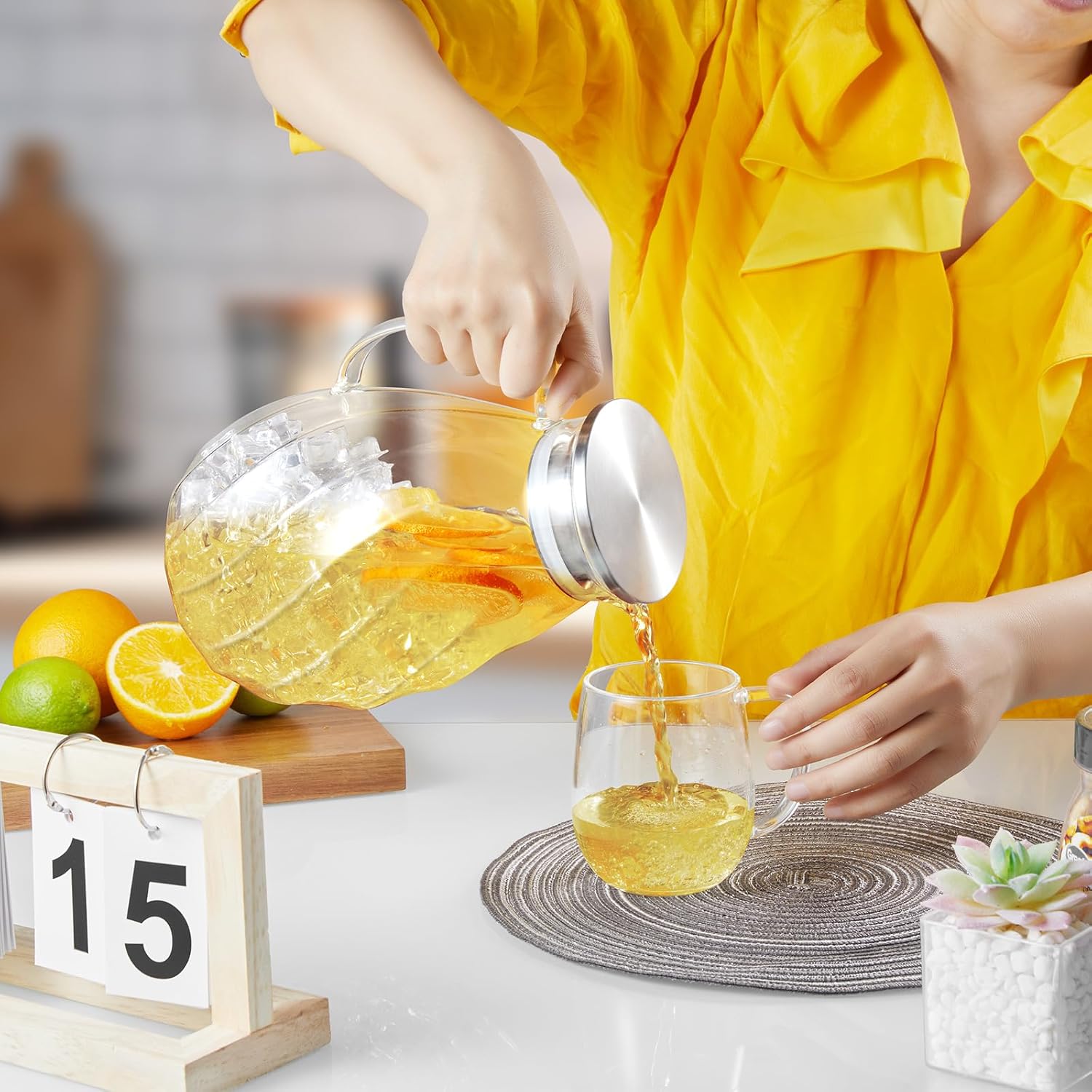 - BOROSILICATE GLASS PITCHER: The tea pitcher is made of borosilicate glass, lead-free, BPA-free, sturdy and lightweight, crystal clear so you can easily display your favorite drink, maintain the original flavor of your beverage better than a plastic drink pitcher, and no need to worry about chemicals