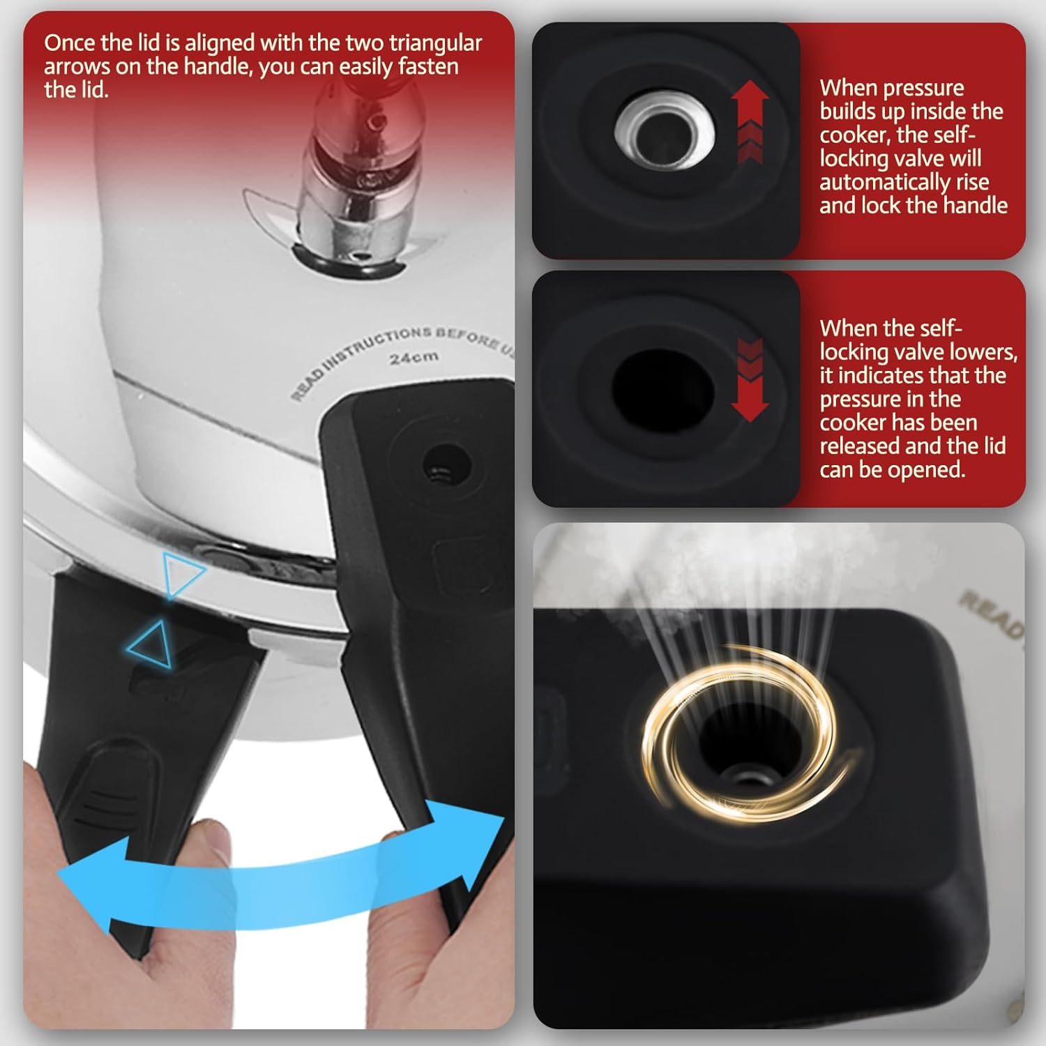 - β [Advanced safety design]-Deeluban induction pressure cookers feature innovative automatic pressure-limiting valves, self-locking valves, safety valves and safety windows. The automatic pressure-limiting valve keeps the pressure at optimal levels during cooking; When sufficient pressure builds inside the cooker, the central rod of the self-locking valve rises, and once the pressure is released, the rod lowers, allowing the lid to be opened; If the internal pressure exceeds the safety limit, the safety window automatically releases the pressure.