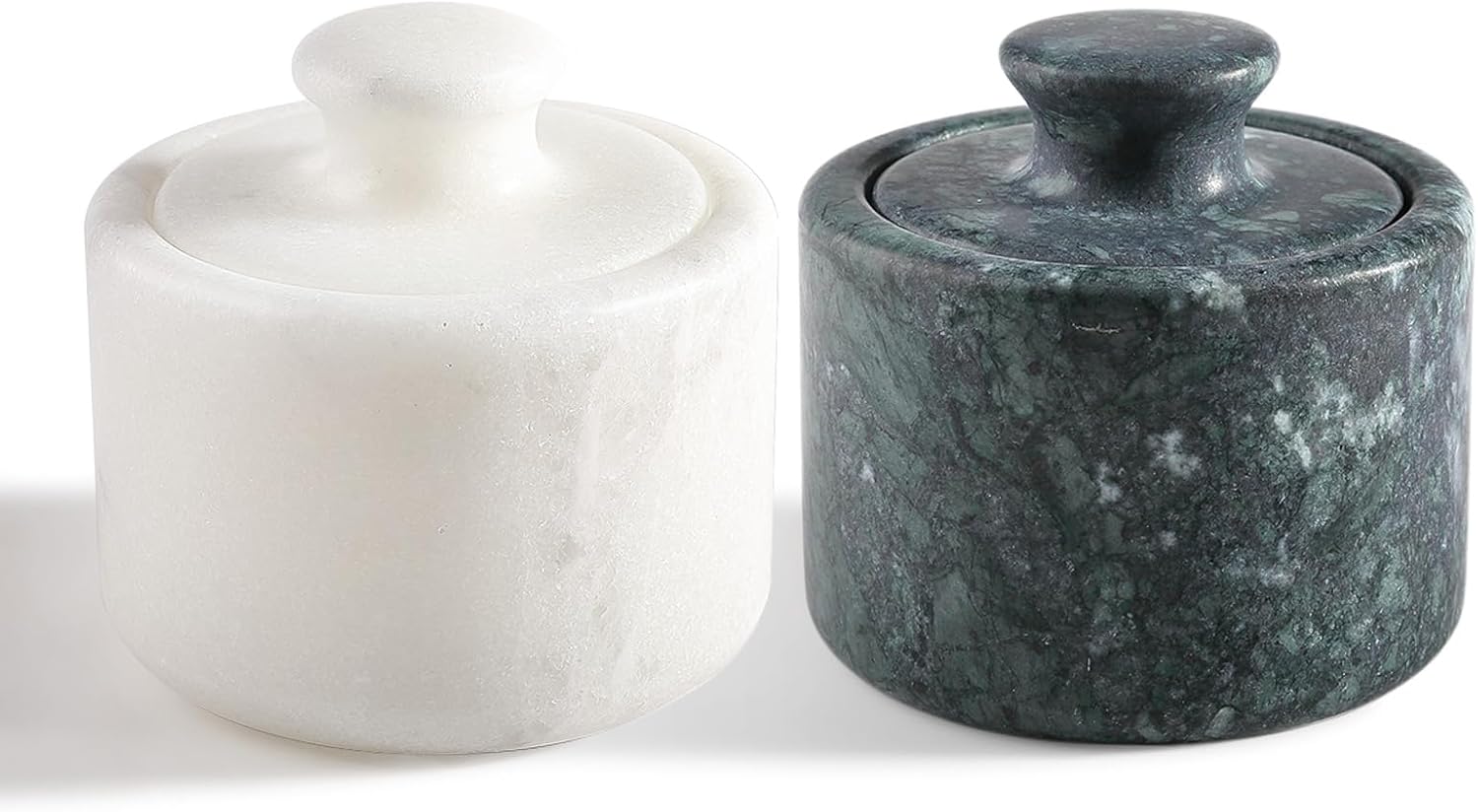 Koville Marble Salt Cellar White and Green Salt Holder with Lid for Kitchen Table Décor, Elegant Modern Handcrafted Seasoning Container for Countertop, Salt and Pepper Holder & Coffee Beans Storage