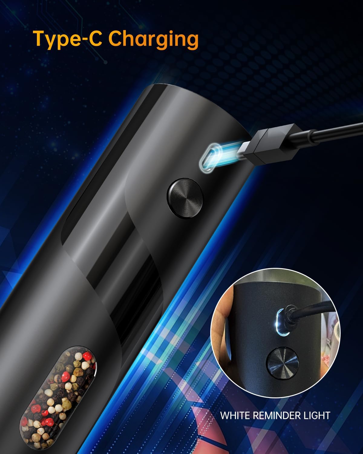 CIRCLE JOY Rechargeable Electric Salt and Pepper Grinder Set with Base, Automatic Pepper Mill Grinders with 110ml Container, Adjustable Coarseness and White LED Light, Black