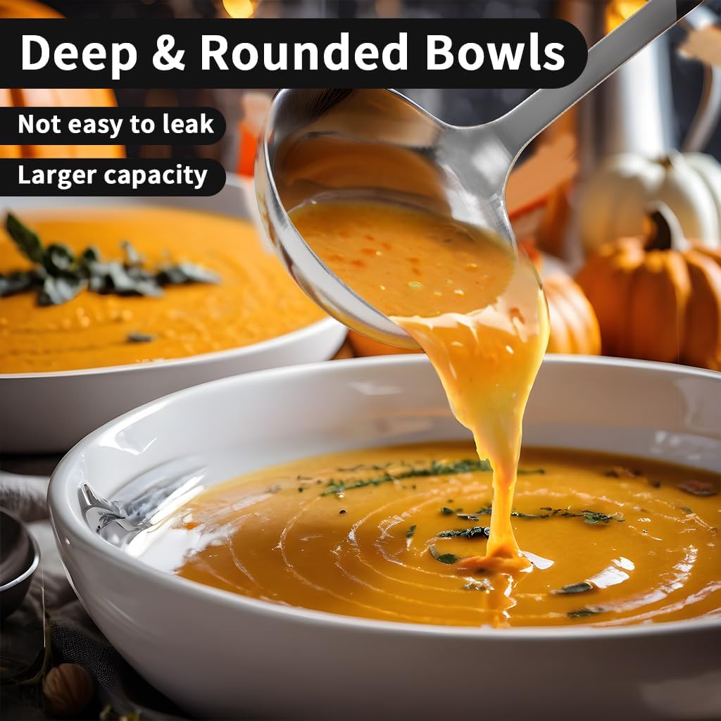 - UNIQUE & FUNCTIONAL DESIGN: Premium stainless steel construction. Built with a balanced blend of beauty, strength and comfort.The long handle is very comfortable in hand, reducing heat transfer, not easy to burn your hands.is perfectly proportioned for stirring, serving soups, stews and more. The perfect size for scooping soup from a deep pot and pouring into serving bowls conveniently and efficiently.