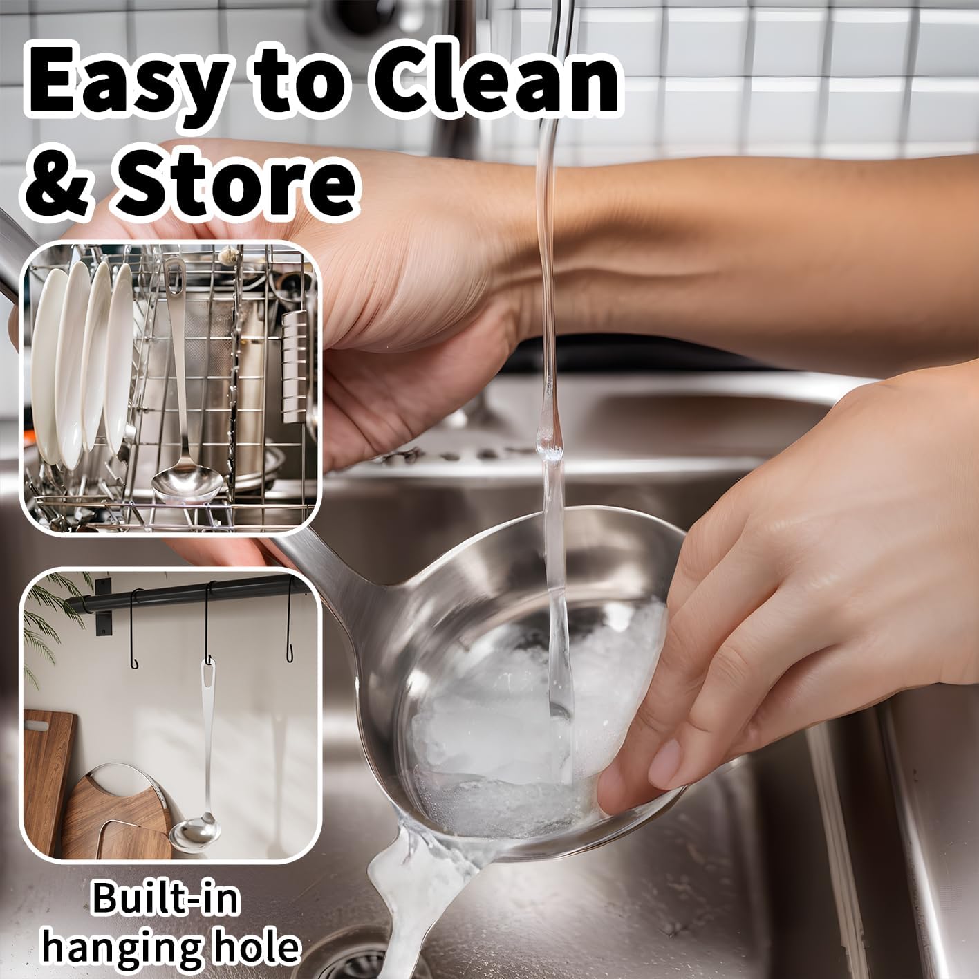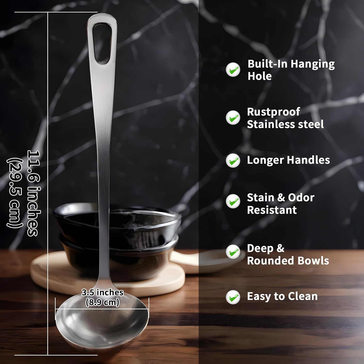 - Easy to Clean: Heavy gauge 304 stainless-steel construction is 100% dishwasher friendly and also cleans up quickly and easily in the sink. Wont rust or corrode like regular metal. The deep bowl is perfect for stews, chili, spaghetti sauce and soups too. Our soup ladle will take care of all of your needs.