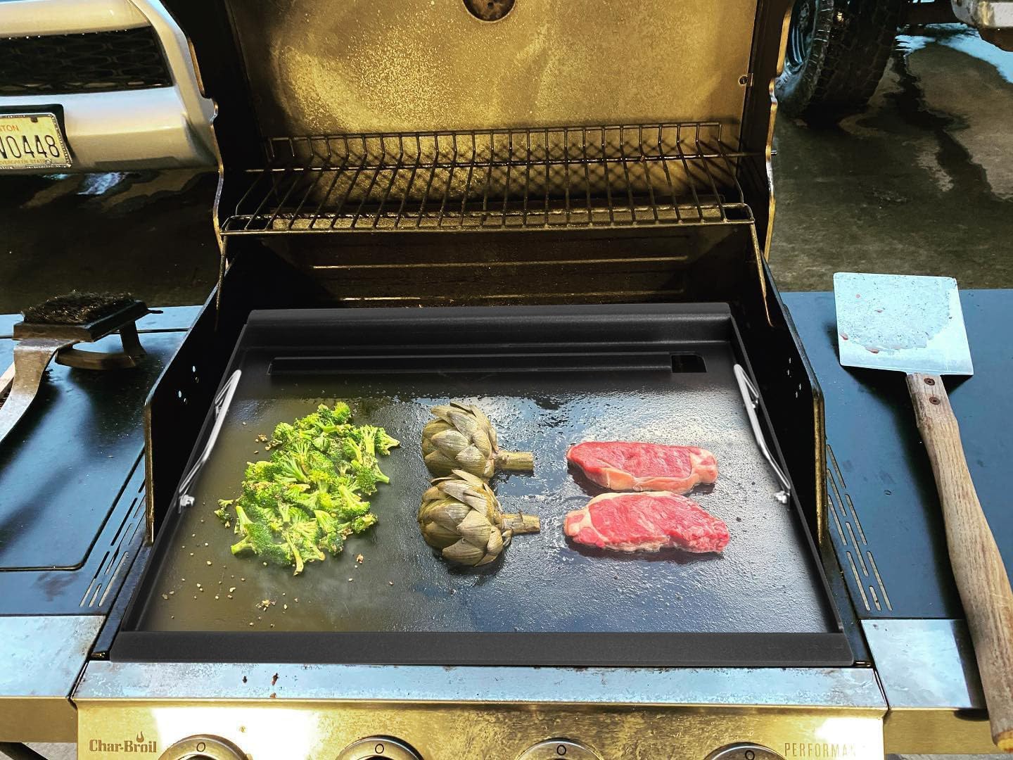 - 【Features】The inserts griddle is closer to the fire source and heats up more easily than other griddles placed on the grates to achieve the temperature needed to cook delicious food. Before use, please remove the grate & emitter plates to achieve closer to the heat source. The surface of the baking pan is made of coating, durable and easy to clean, need to be heated and oiled 1-2 times before use for better results.
