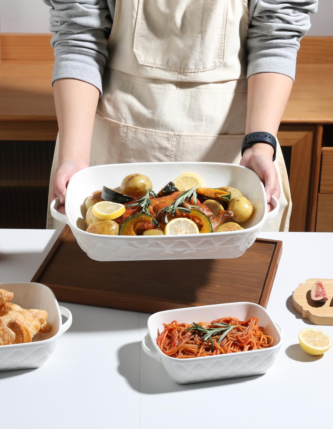 - 【MEET ALL BAKING NEEDS】The ceramic baking dishes set made of safe materials, suitable for heating and storage of bread, pasta, casseroles, lasagnas, roasts, chicken, barbecue, beef, vegetable food, to meet your different needs.