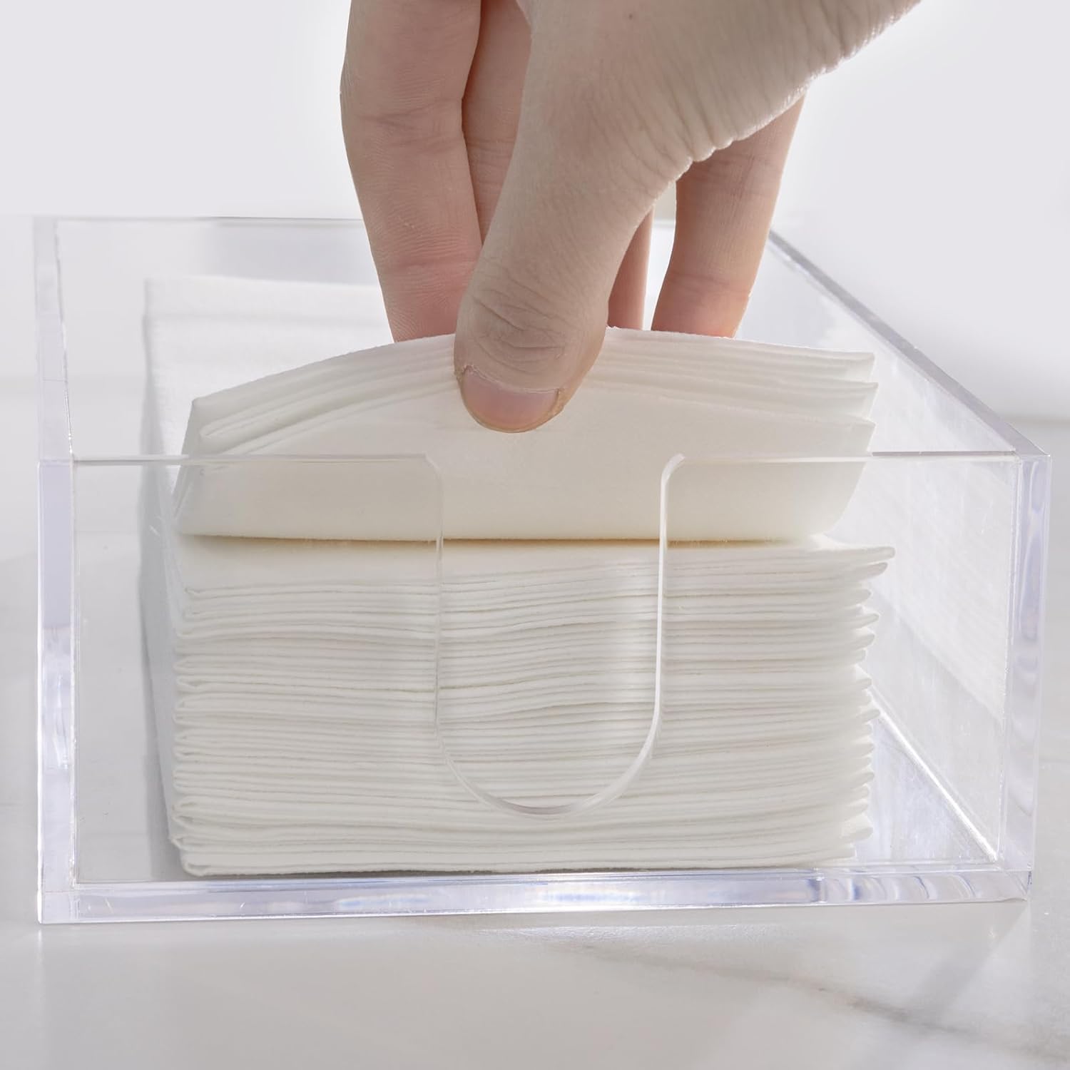 - Stress-Free Reach: Featuring an innovative side U-cut, this bathroom napkin holder tray delivers instant access to napkins - even with messy hands. Just pop it on your countertop (no tools needed) and enjoy one-handed convenience.