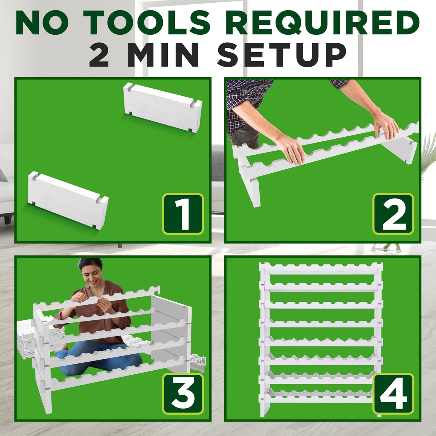 - NO TOOLS 2 MIN SETUP - The modular wine stacker assembles in just 2 minutes or less. The freestanding 8-tier modular wine display shelf comes in 16 wave bars and 16 blocks that easily snap together with no need for any hardware or tools.