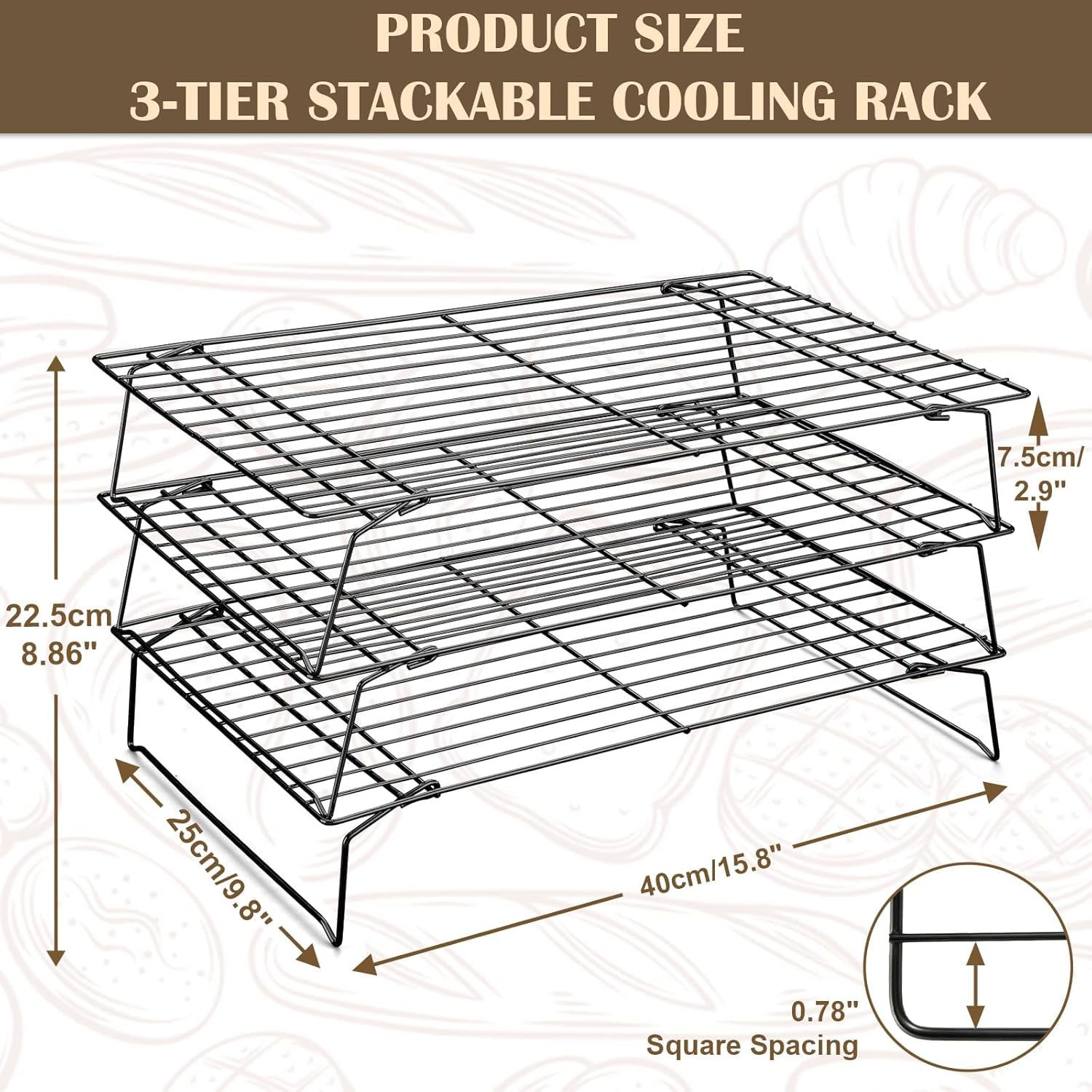 - 【THREE STACKABLE TALL COOLING RACKS】Consists of three separate stainless steel cooling racks. The stackable design provides multiple levels of space, allowing you to bake and cool multiple foods at the same time. Enjoy more food together with your family