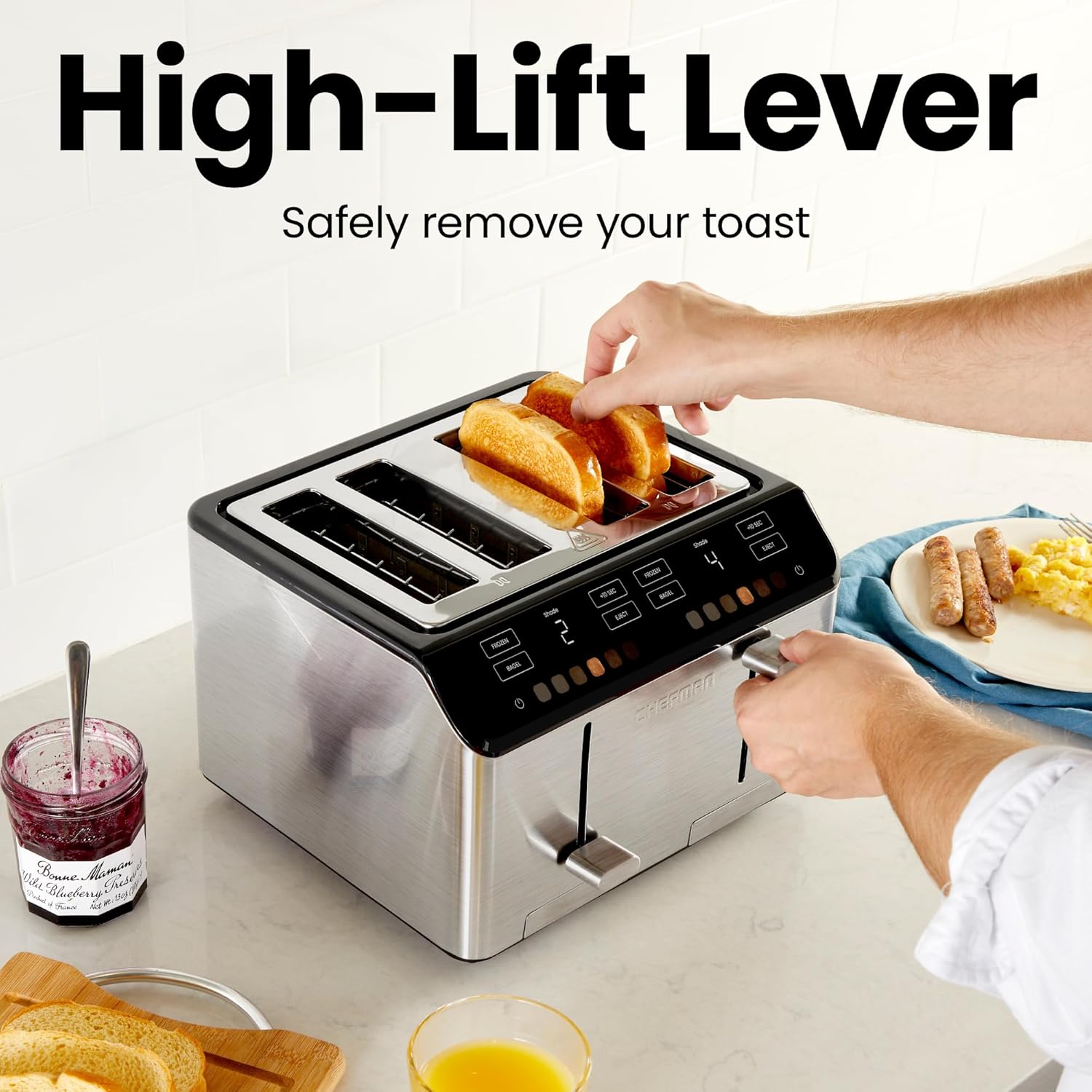 Chefman Smart Touch 4 Slice Digital Toaster, 6 Shade Settings, Touchscreen Bagel Toaster 4 Slice with Extra-Wide Slots, +10 Seconds, Defrost, Removable Crumb Tray – Stainless Steel