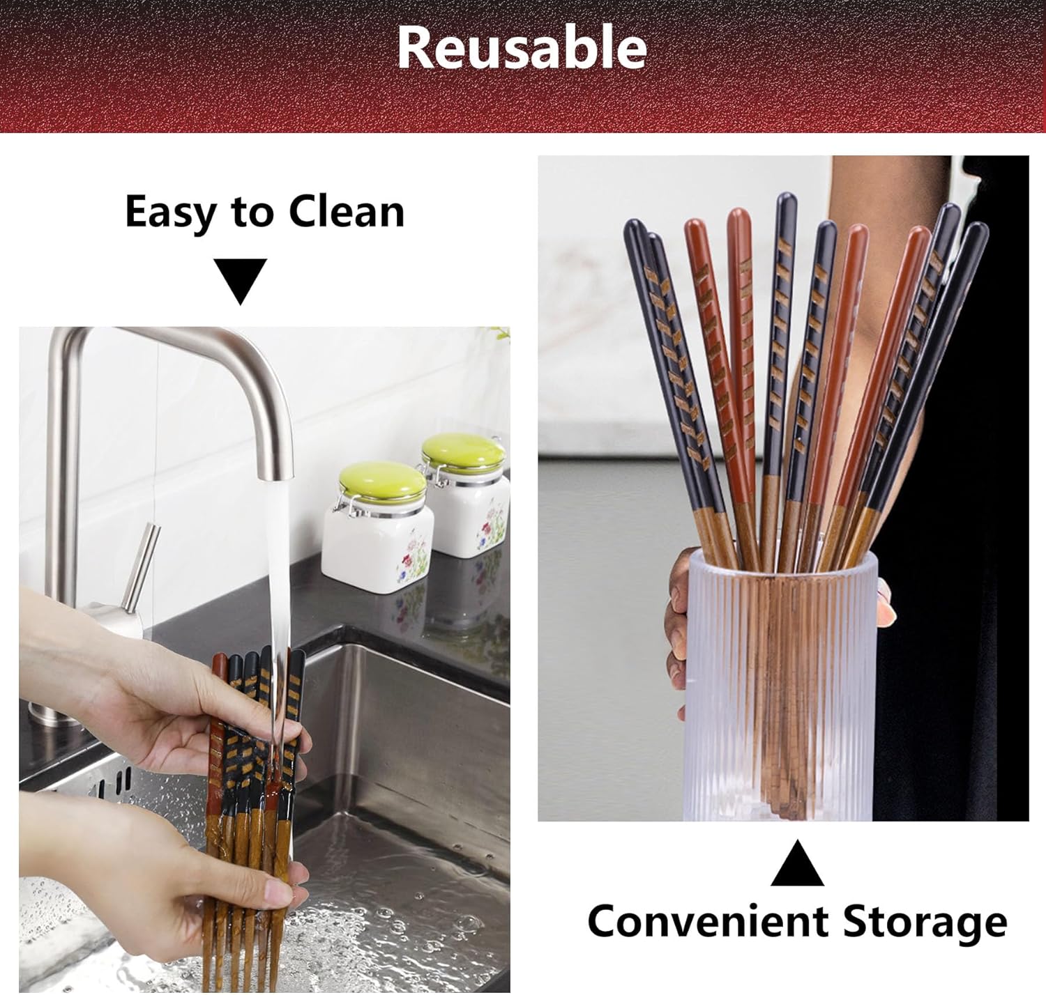 - Reusable Wooden Chopsticks: Easy to clean. Say goodbye to disposables. Use at restaurants or home, for eating Asian meals, or popcorn chicken, fried chicken and French fries for a really fun dining experience