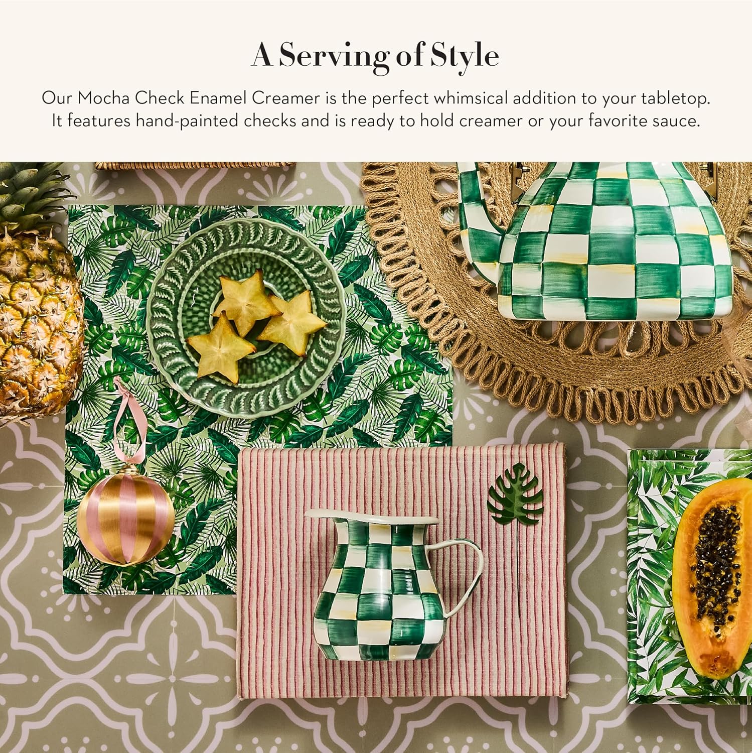 MACKENZIE-CHILDS Enamel Creamer, Creamer Dispenser with Pour Spout, 14-Ounce Capacity, Green-and-White Emerald Check