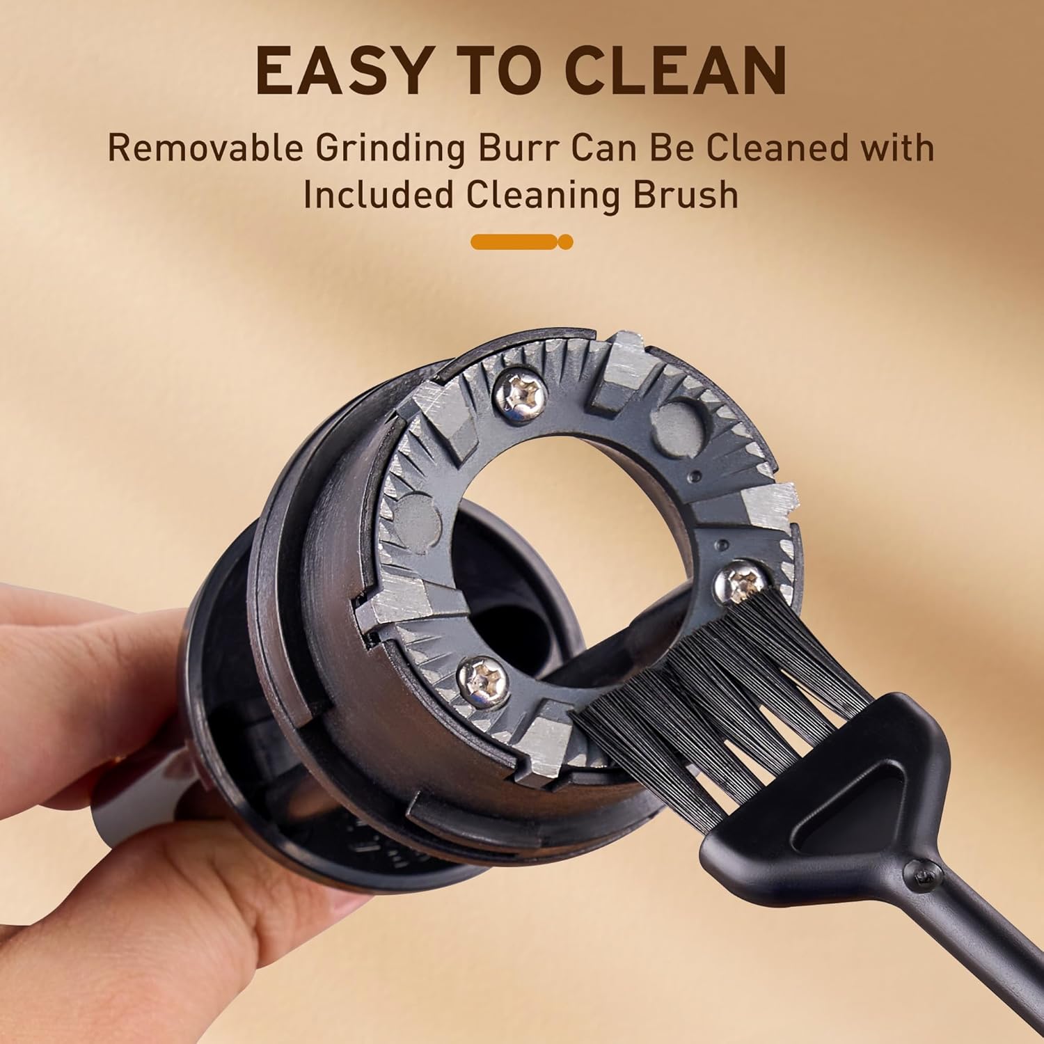 - Easy to clean: Flat burr coffee grinder with cleaning brush ensure you clean your coffee grinder each time. Removable hopper and upper burr are easy to clean