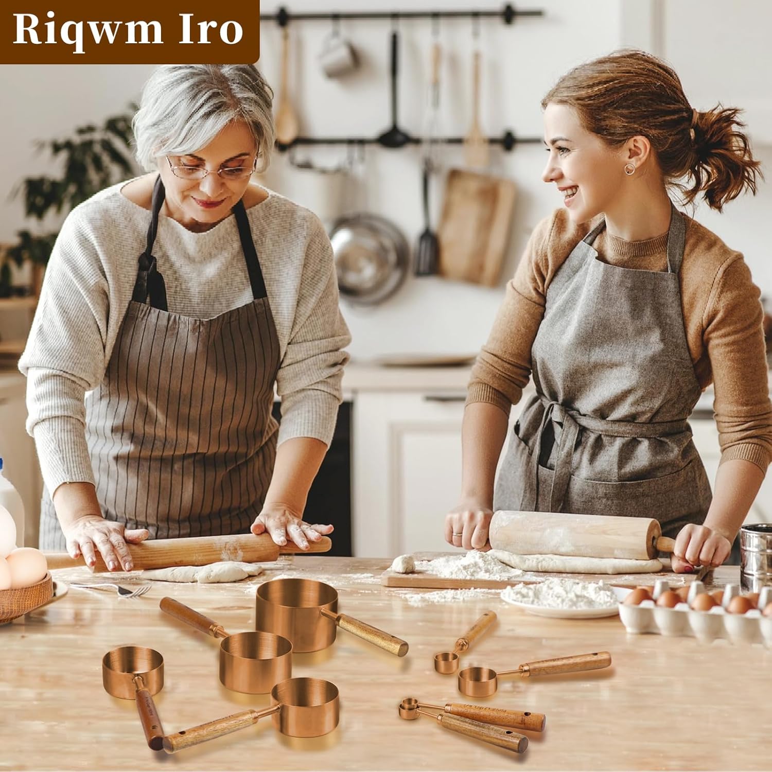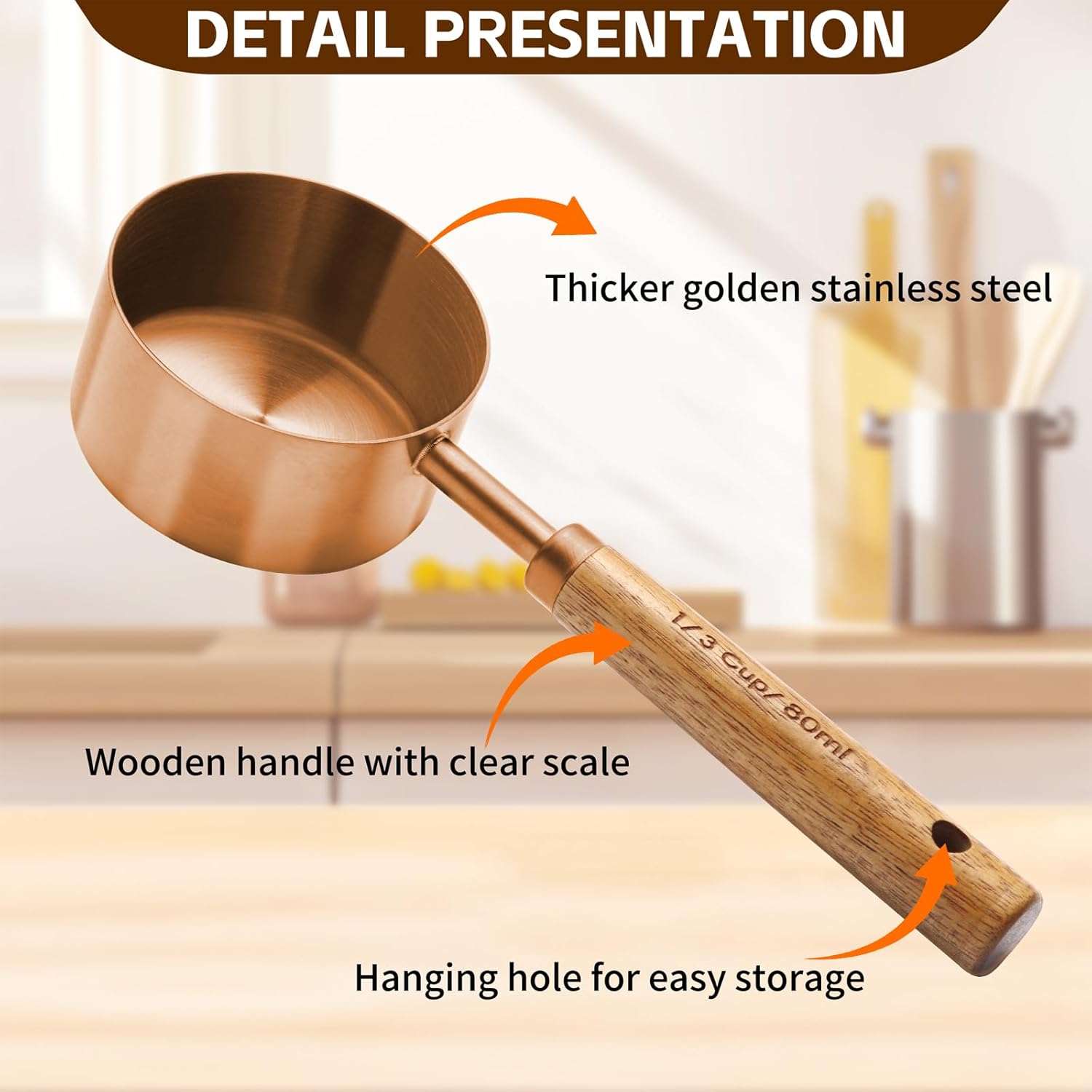 Copper Stainless Steel Measuring Cups and Spoons Set,8 Piece Measuring Cup Set with Wooden Handle and Metric and US Measurements,Copper Polished Finish,for Cooking and Baking in The Kitchen