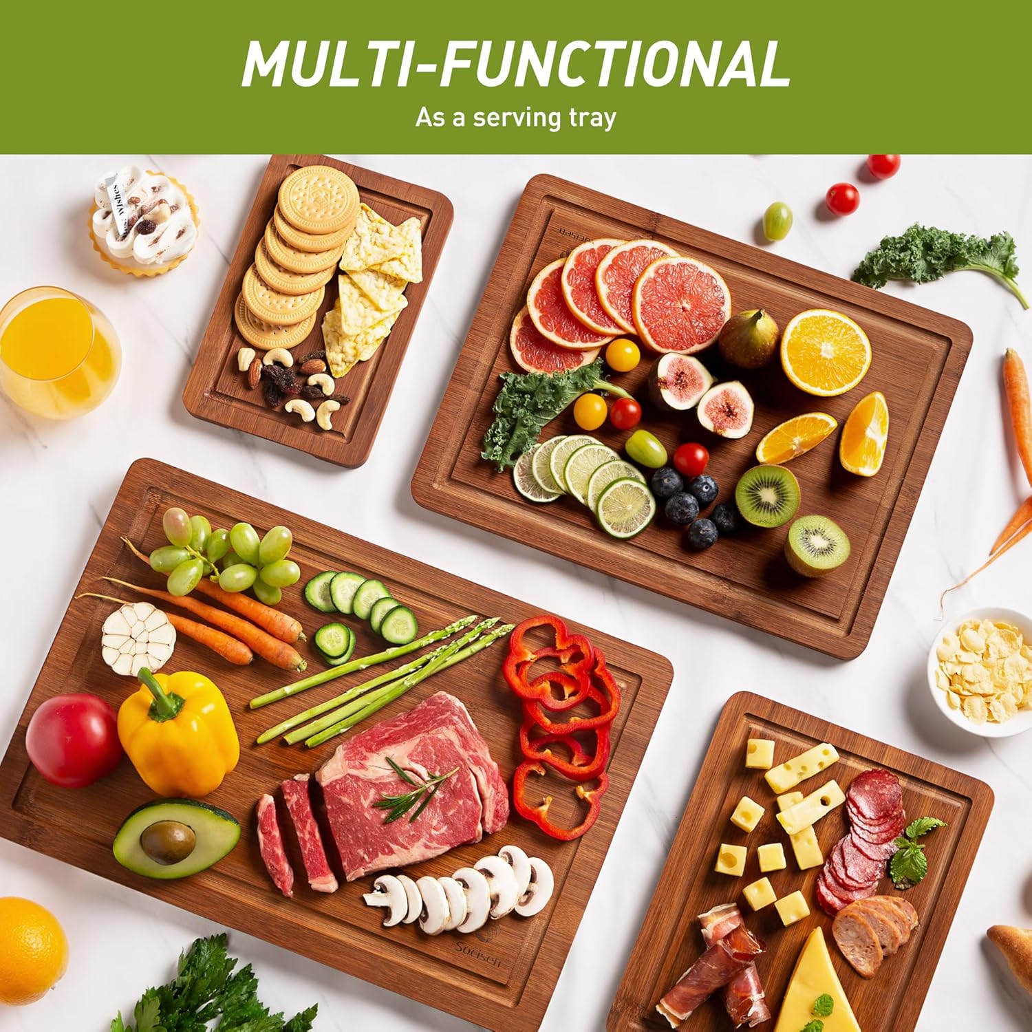 - Four Perfectly Sized for Versatile Use: Our bamboo cutting board set has four sizes β 9"x6", 11"x8.5", 14.5"x11" and 17.5"x12" . This set of 4 bamboo cutting boards are perfect for everyday food preparation, from slicing fruit to chopping veggies. Thoughtfully sized to fit different needs without taking up too much counter space. Whether dicing veggies, slicing fruits, or carving meats, there's a chopping board for every occasion. Perfect for various kitchen tasks and charcuterie boards.