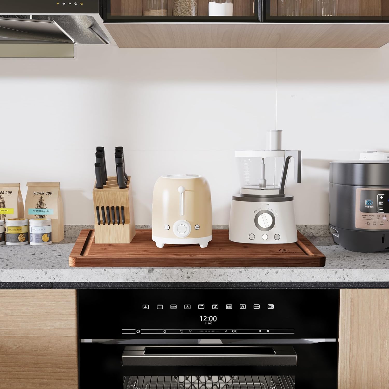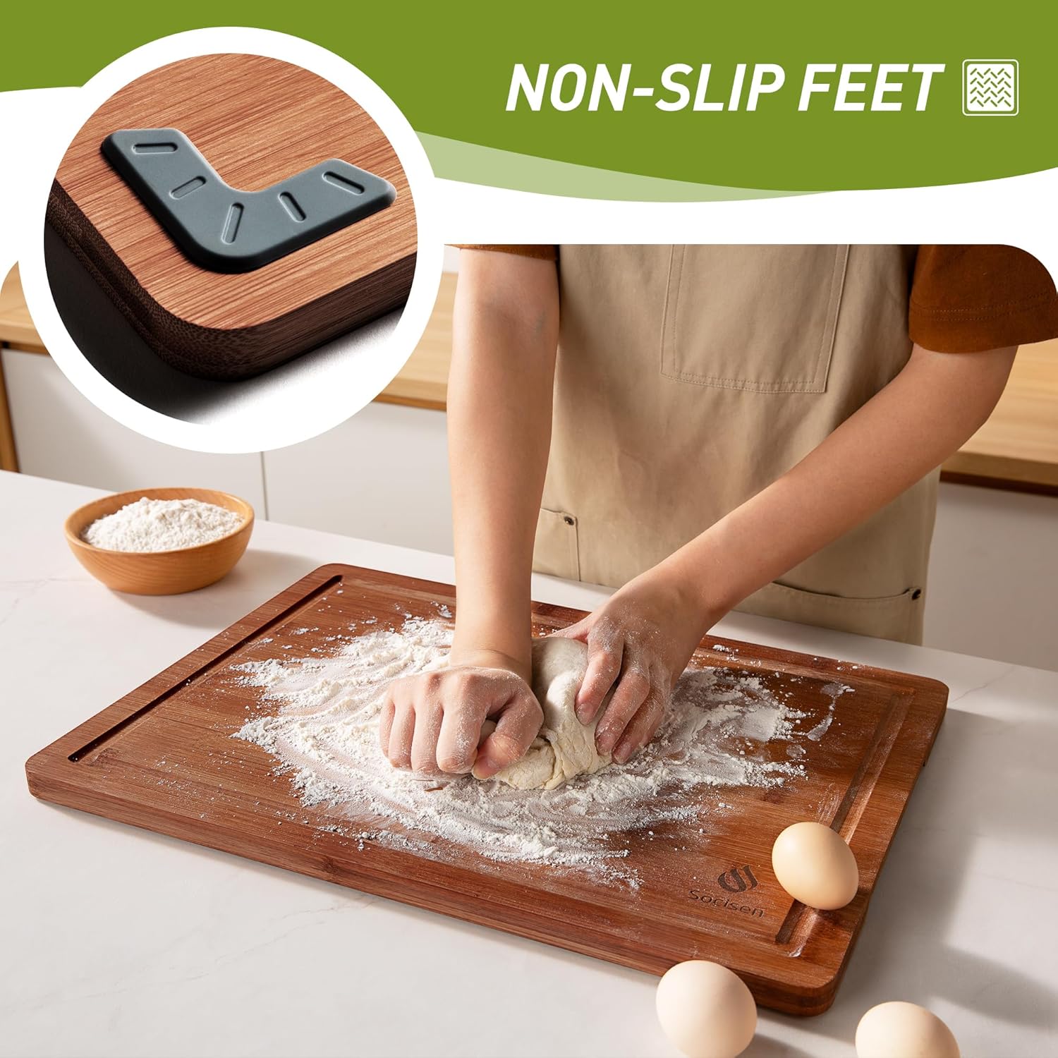- Perfectly Sized for Versatile Use: Our bamboo cutting board has perfectly sized for Versatile Use. This extra-large bamboo cutting board, sized at 19.5 x 14 inches, is your kitchen's best ally for preparing large feasts. Its non-slip design ensures stability during carving and slicing of turkeys, prime rib, and more. The generous surface area keeps meal prep organized and clutter-free, making it a must-have for any cooking enthusiast. Perfect for various kitchen tasks and charcuterie boards.