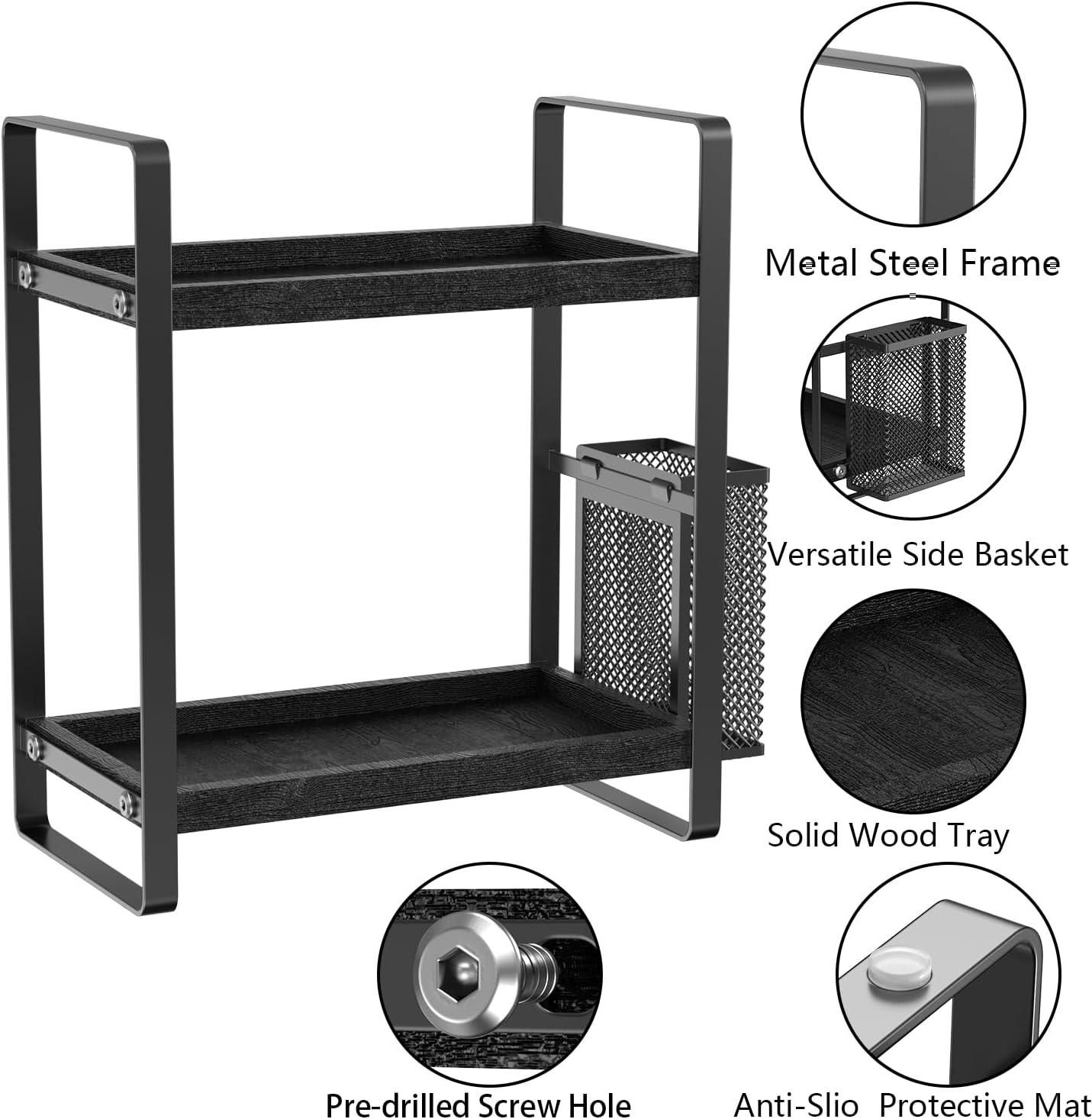 - 【Vintage Elegance】The black matt paint steel frame of the seasoning organizer has an industrial look that perfectly complements the rustic and aesthetic wood grain shelves, creating a charming mix of styles that will complement your decor. The silent sponge installed at the bottom of the support frame protects your countertop from damage.