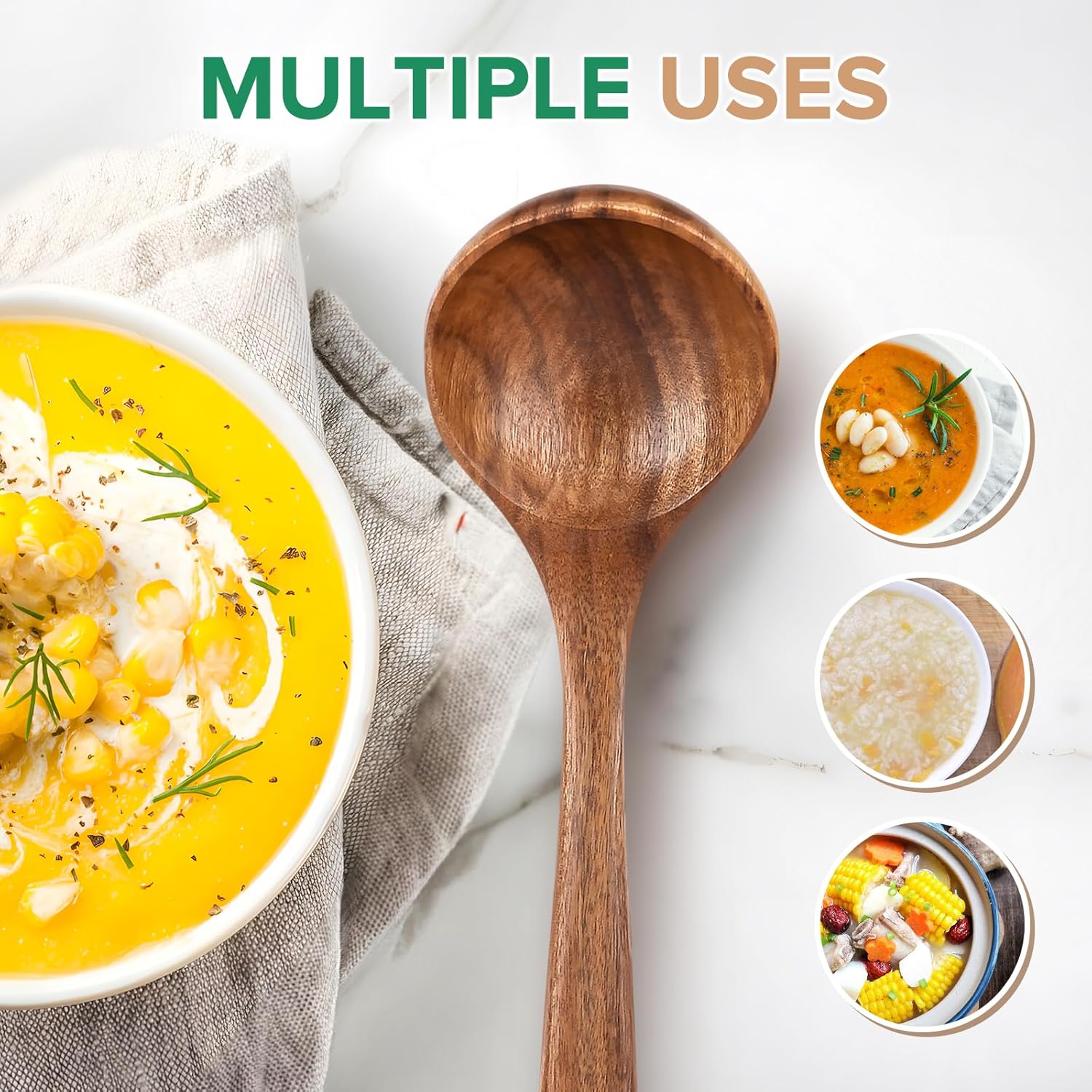 - Premium Material:This wooden soup ladle is made of food-grade natural teak wood.Non-toxic,no-rust,heat-resistant, bpa-free and healthy for daily kitchen use.Our non-stick wooden ladle is also lightweight solid,hard texture, good stability,no crack and won't deform easily.