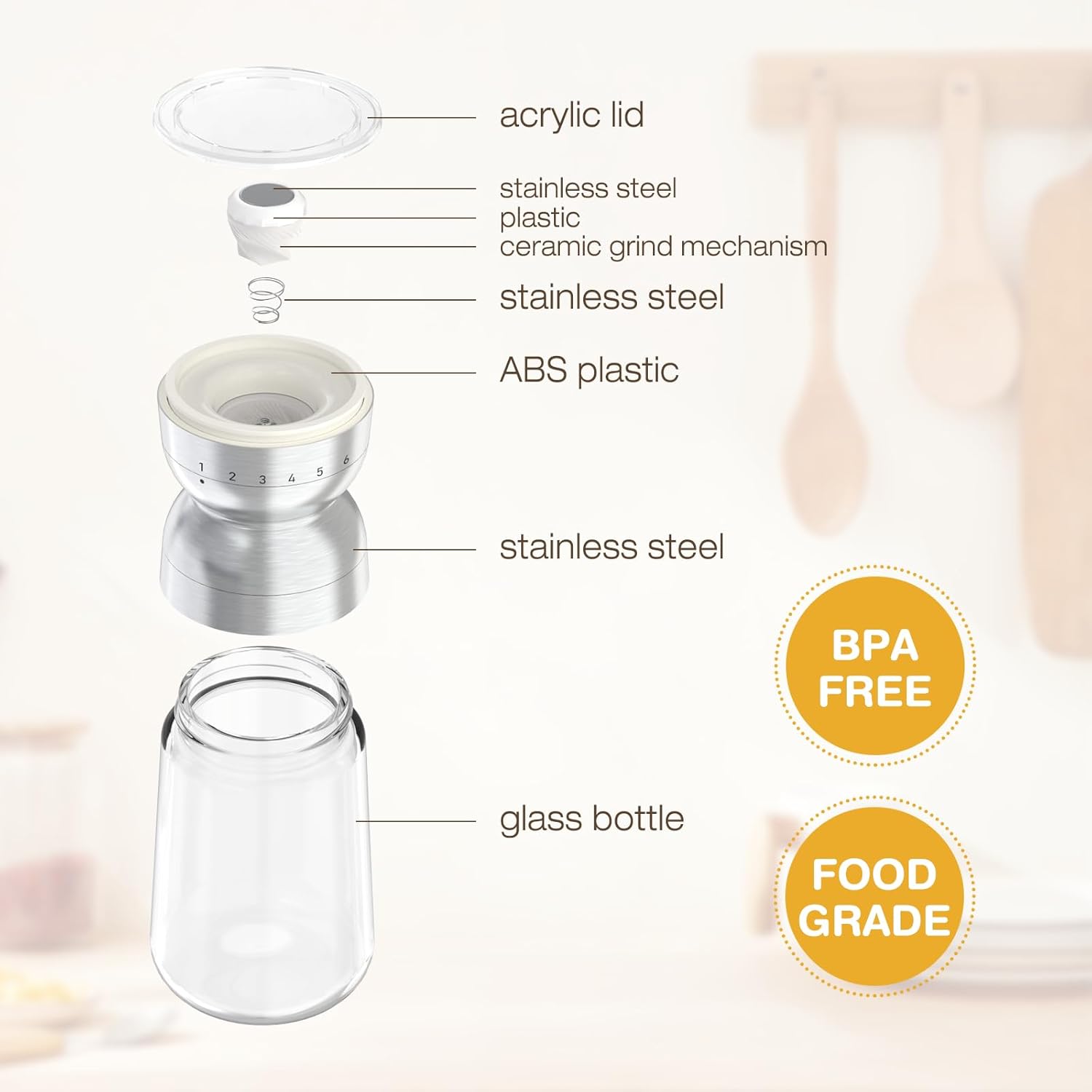 - Large Capacity & Durable Construction - The glass bottle can hold about 10 oz salt or 4.7 oz pepper . The pepper mill reduces the need for frequent refills. Made from high-quality glass, stainless steel details and with a ceramic burr, it is built to last.