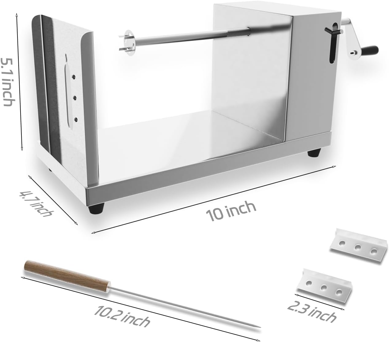 - SIZE AND PACKAGE: Tornado potato cutter measures 10 inch (L) x 4.7 inch (W); Nicely packaged: 1 x tornado potato cutter, 2 x replacement blades, 1 x sharp drill, 1 x manual
