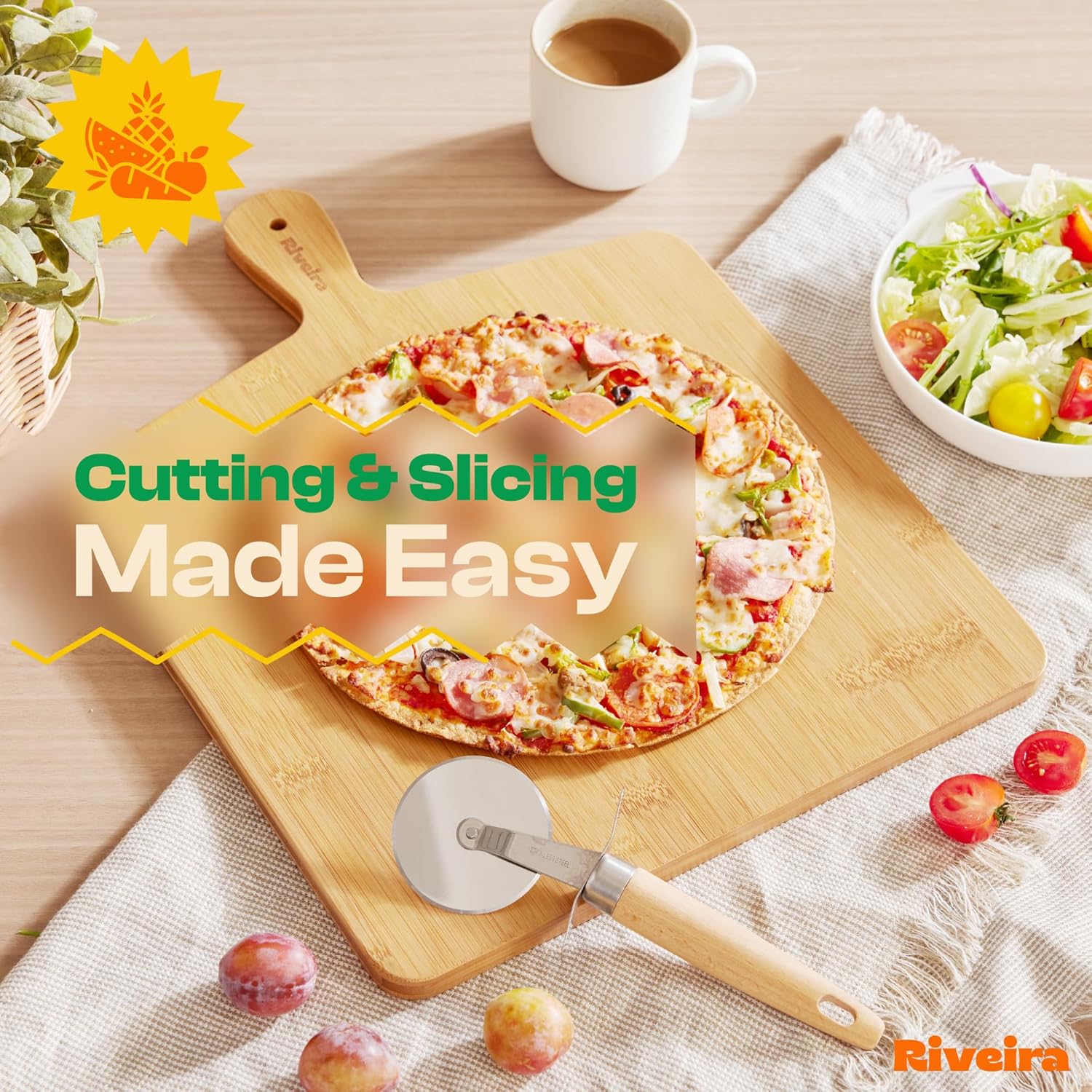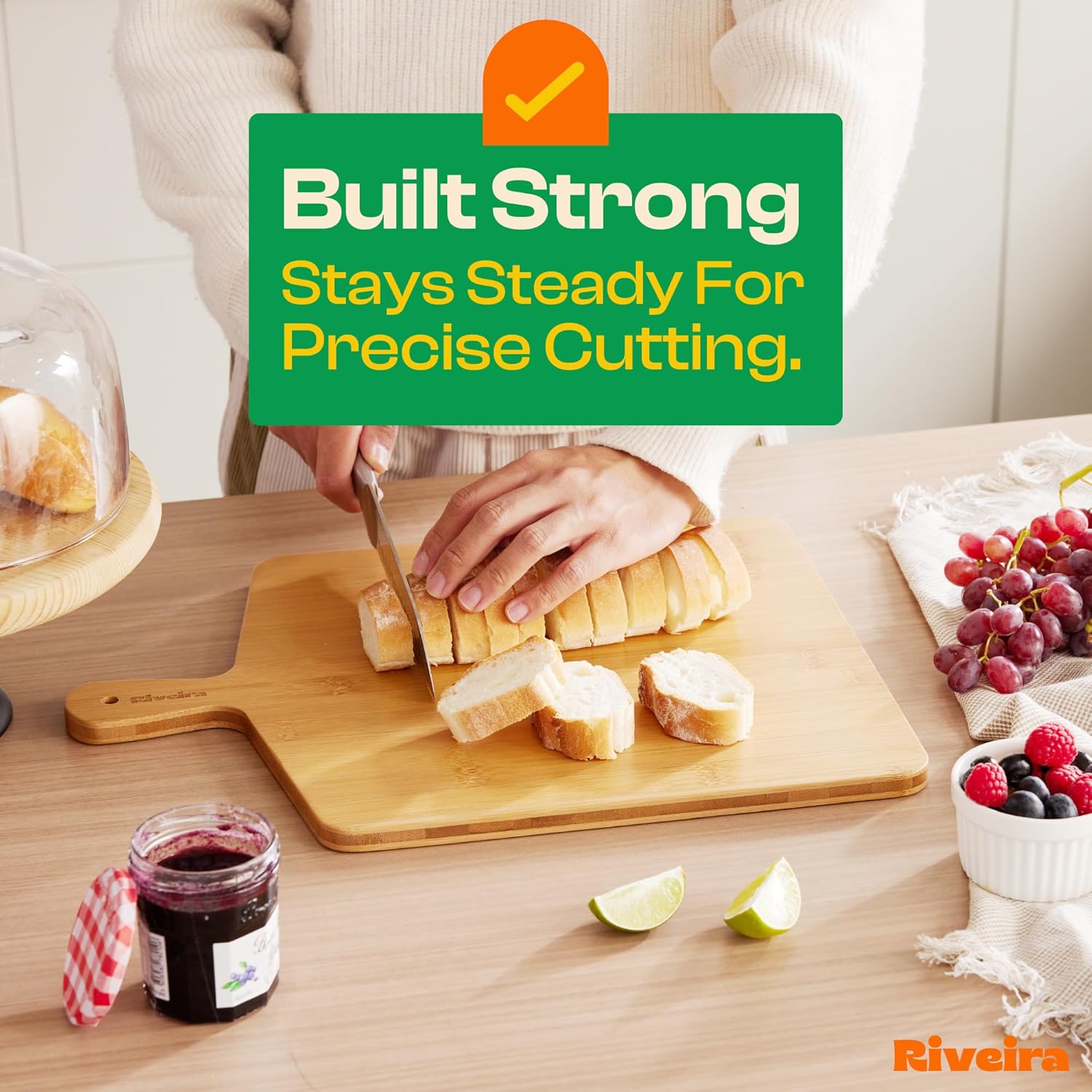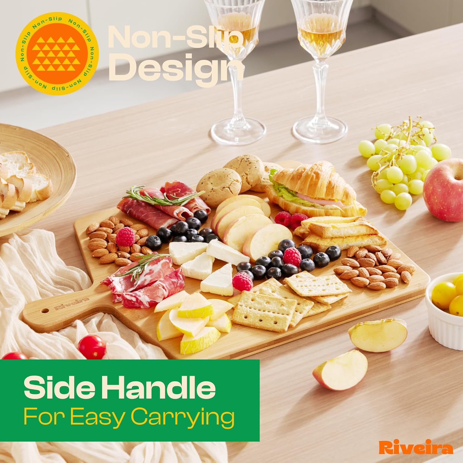 - Premium Crafted Bamboo — Take a detour from traditional kitchen aesthetics with this white bamboo wood board crafted from 100% natural bamboo. Beyond being an unconventional and eco-friendly choice, the chopping board wood proudly showcases the environment friendly and organic bamboo. This wood cutting boards for kitchen counter adds an unexpected touch of confidence and style to your once-orderly culinary space. Riviera's wooden chopping boards for kitchen will be there for many years to come.
