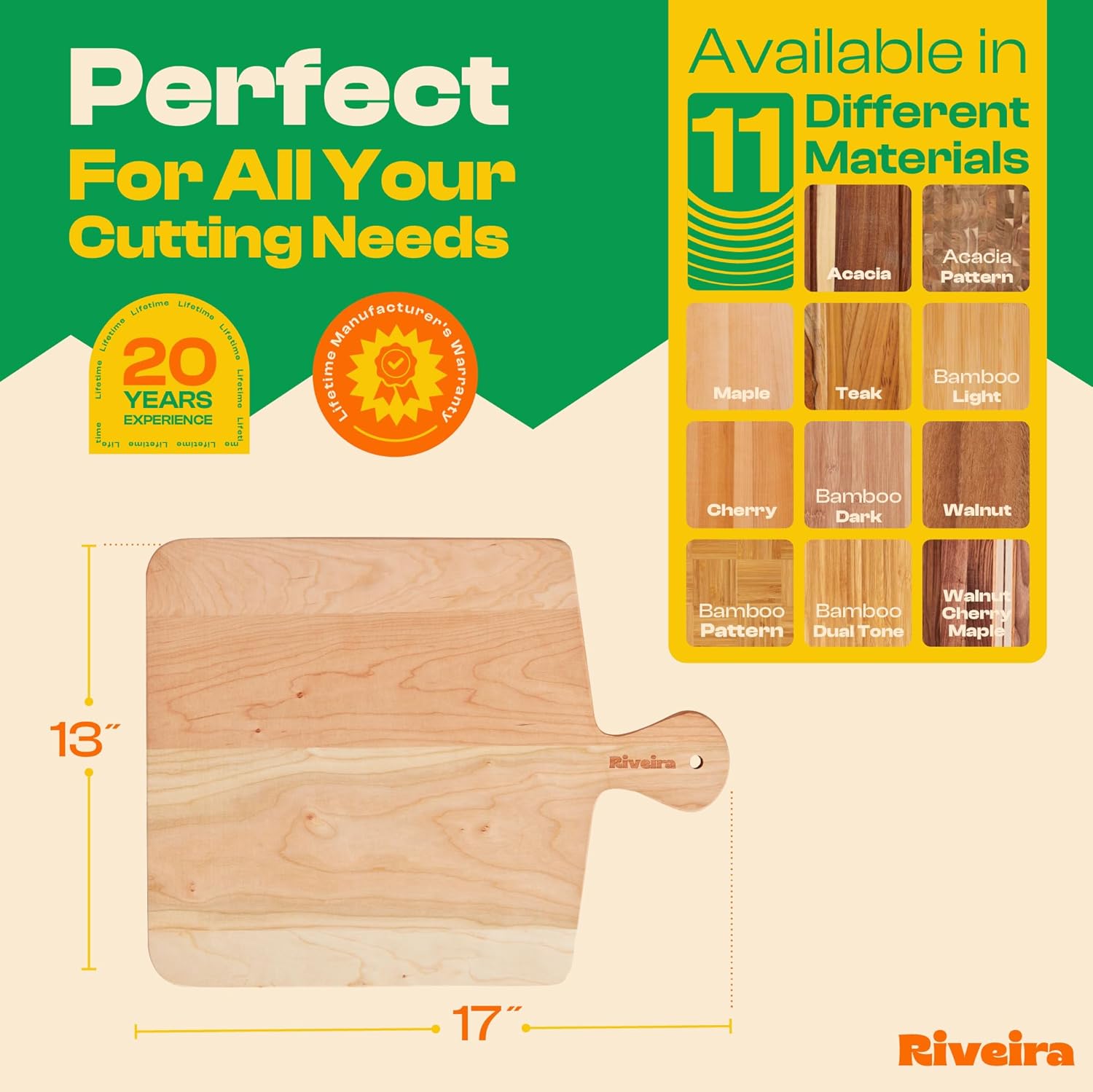- Premium Crafted Cherry — Take a detour from traditional kitchen aesthetics with this cherry wood board crafted from 100% natural cherry. Beyond being an unconventional and eco-friendly choice, the chopping board wood proudly showcases the environment friendly and organic cherry. This wood cutting boards for kitchen counter adds an unexpected touch of confidence and style to your once-orderly culinary space. Riviera's wooden chopping boards for kitchen will be there for many years to come.