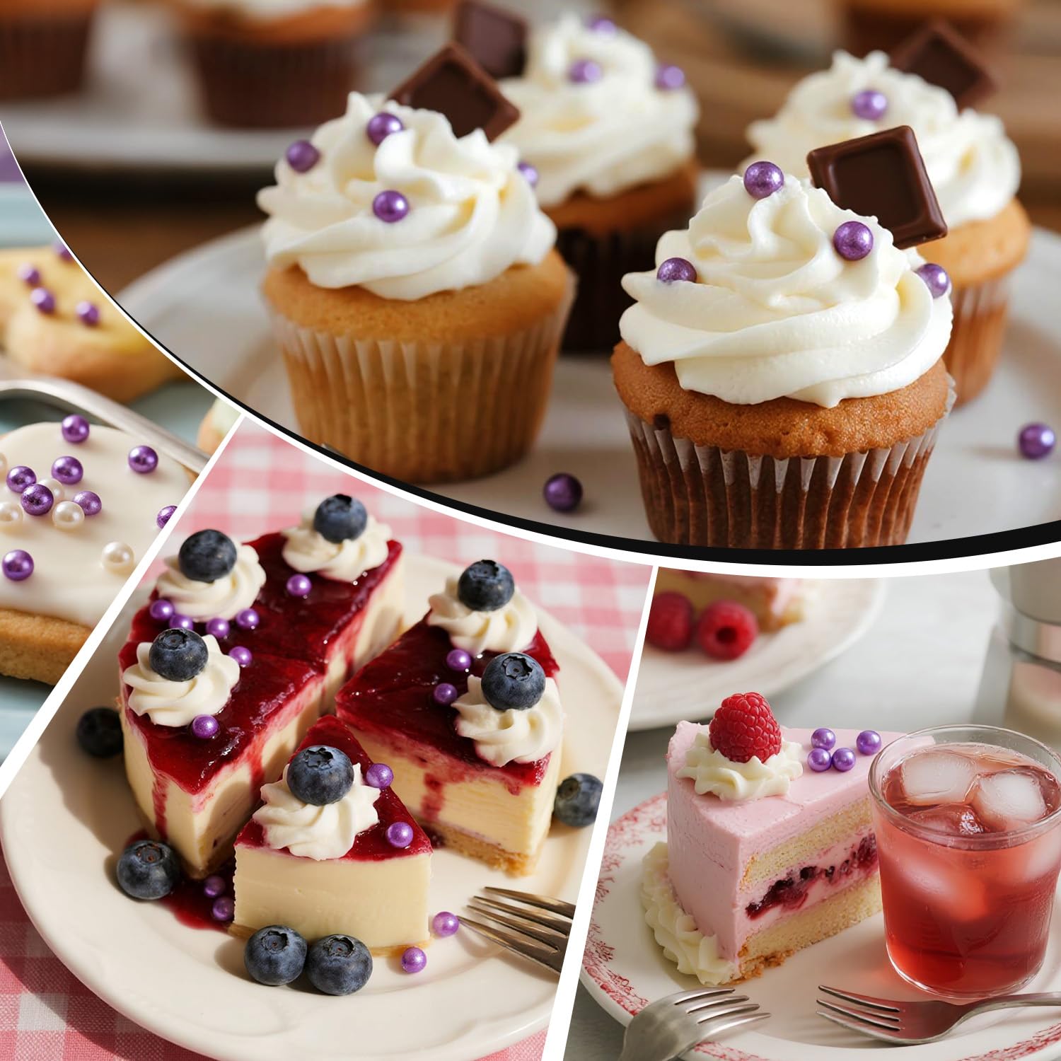 - The Edible Purple Pearl Sprinkles feature a unique mixed-size design. They are perfect for birthday cakes, cupcake toppers, cookies, ice creams, waffles, and any dessert. These sprinkles will make your baked goods prettier.