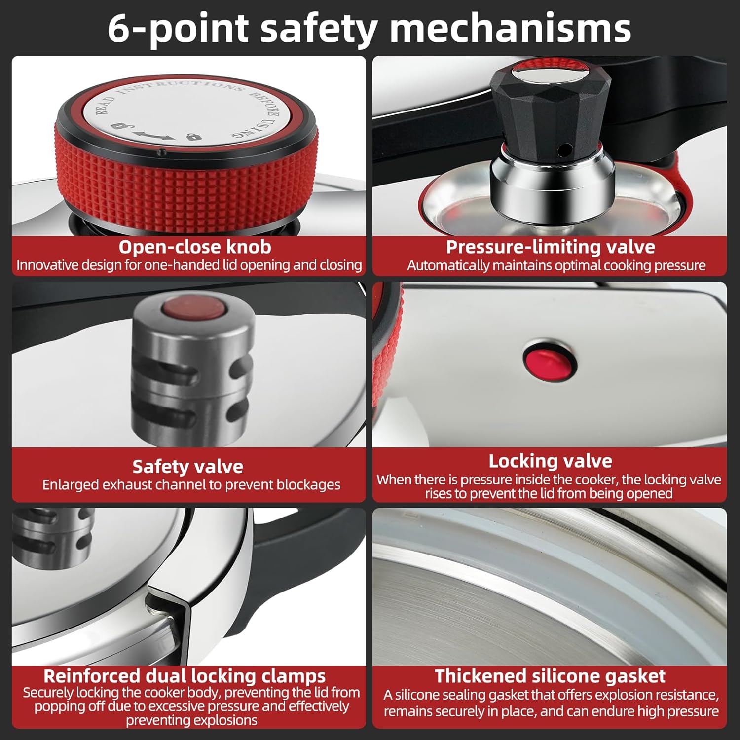- β [Ultra-safe construction]-Our 6-quart pressure cooker is filled with safety-enhancing features, such as an easy-to-lock lid, pressure-limiting valve, safety valve, locking valve, and reinforced dual locking clamps to ensure risk-free cooking.
