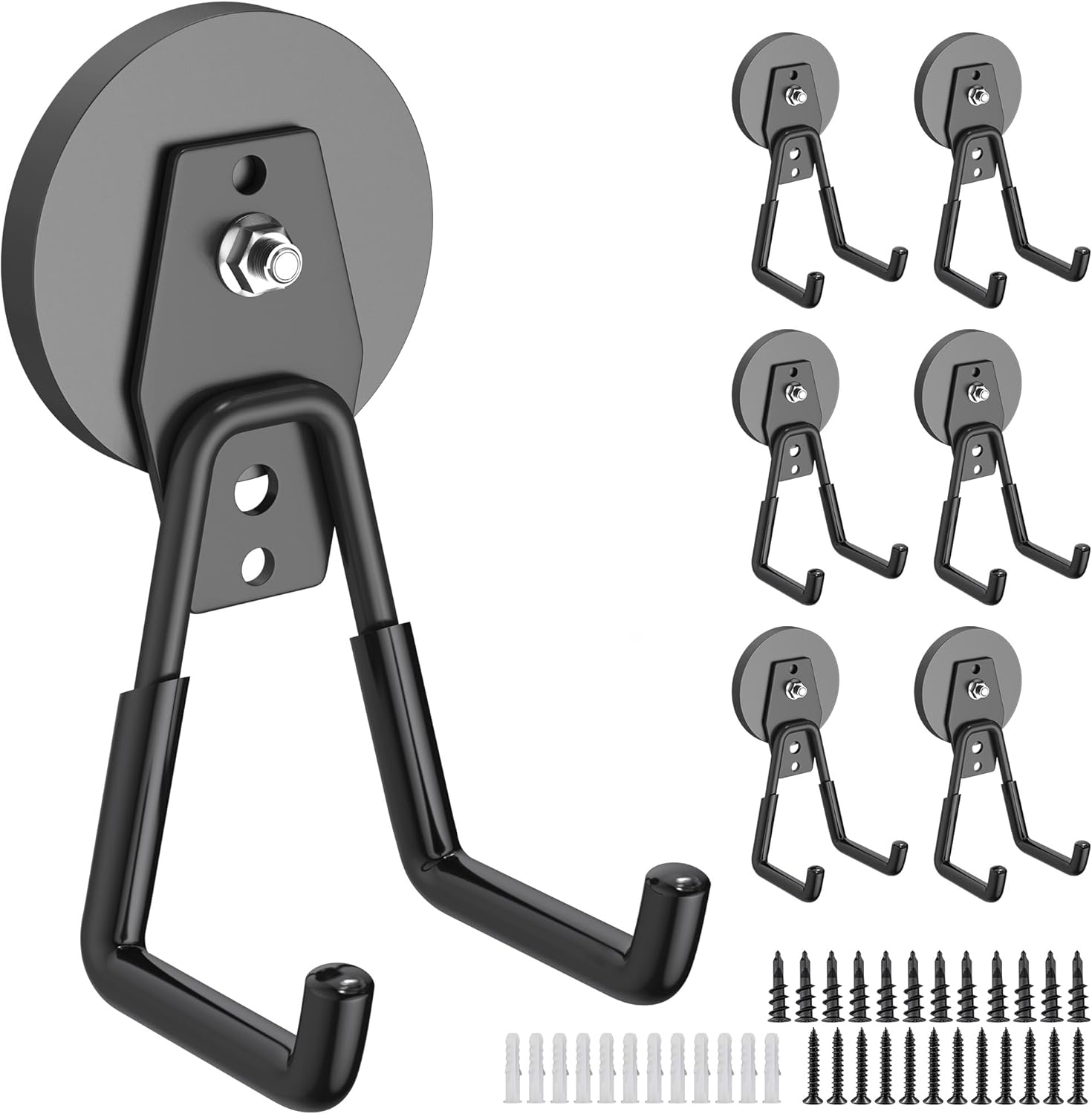 6 Pack Heavy Duty Storage Magnetic Utility Hooks Large Garage Strong Extra Magnet Hooks Hanger with Anti-Slip Coating Heavy Duty Magnetic Hooks for Hanging Power Dril Garage Garden Tools Black