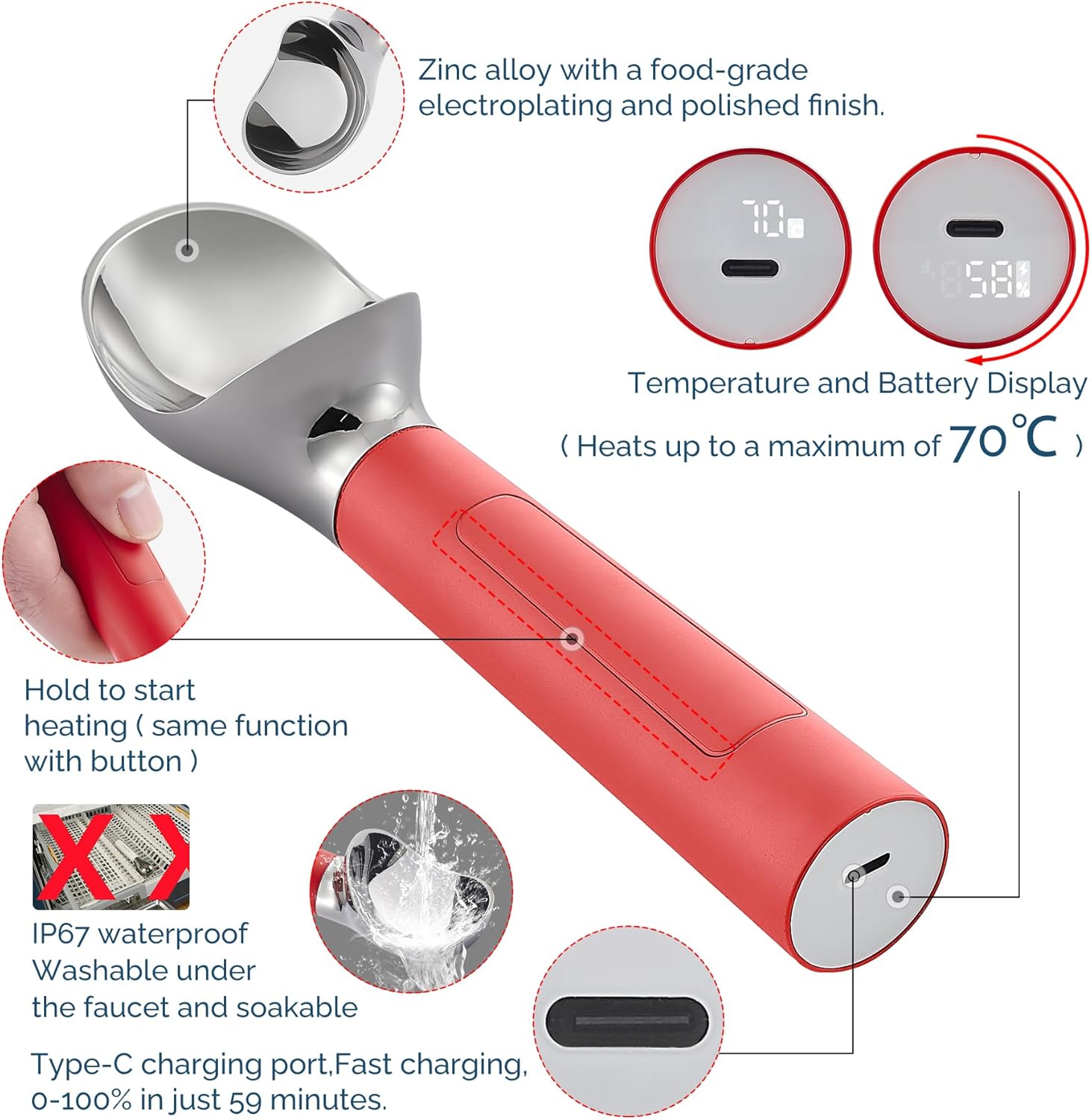 Heated Ice Cream Scoop Rechargeable, Electric Warming Ice Cream Scooper with LED Display, Heats to 158°F for Hard Ice Cream, IP67 Waterproof (Red, 2 oz)