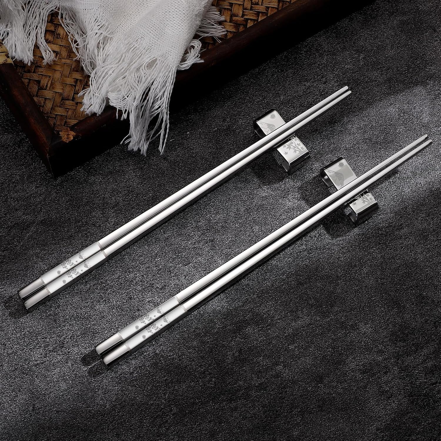 - 【Upgraded Non-slip Design】Our metal chopsticks have laser carved textures on the tips of the chopsticks, making it easy for you to pick up food. Chopsticks are square with rounded corners, so they won't slide off the table. At the same time, they have a perfect weight and are very easy to use, even for beginners.