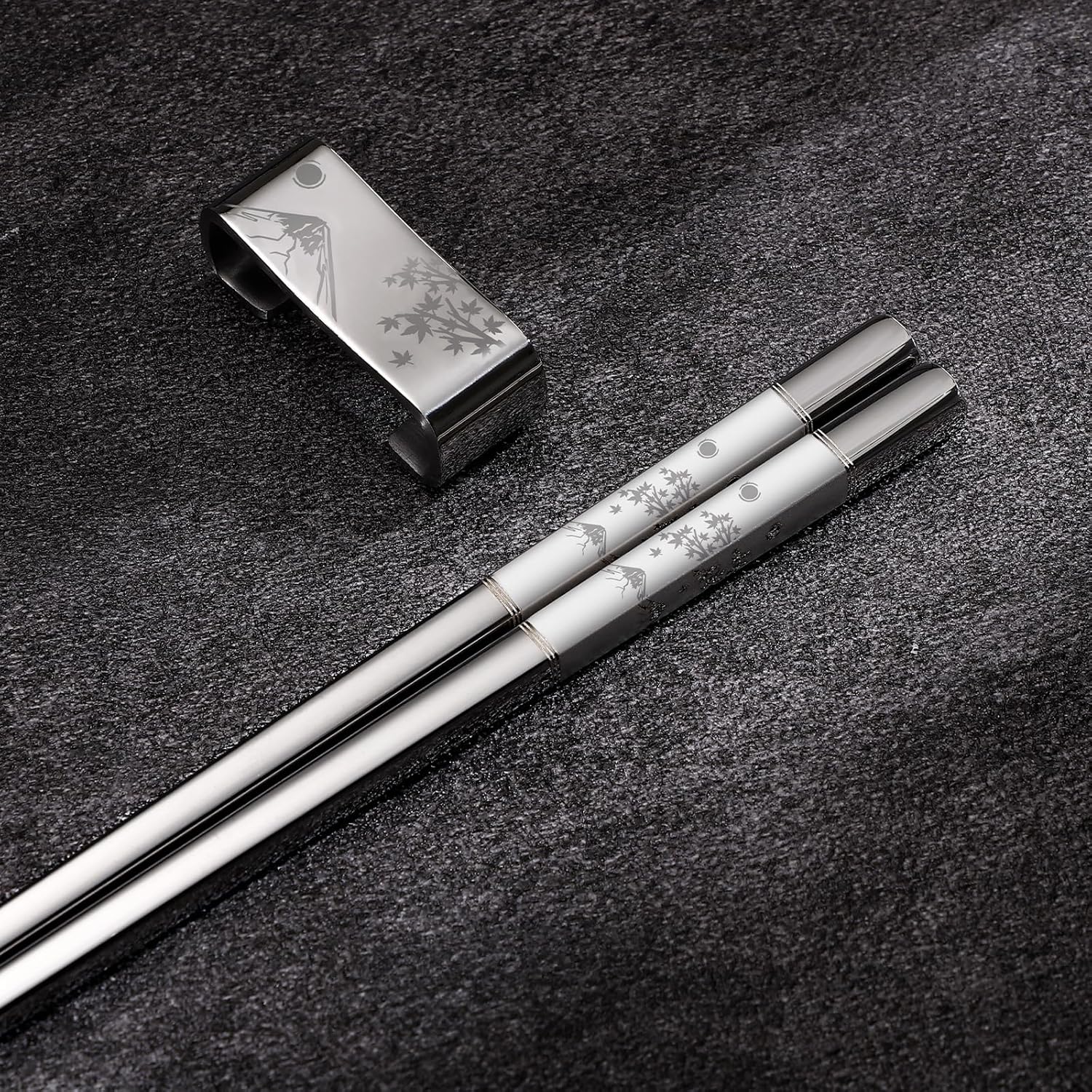 - 【Elegant Pattern】The surface of metal chopsticks is coated with titanium in beautiful colors, and laser carved patterns of mountain and maple leaves have a Japanese style. Titanium is an excellent material used for high-end tableware. Will not peel or discolor after prolonged use. The titanium coating on stainless steel chopsticks makes reusable chopsticks more sturdy and less prone to scratches.
