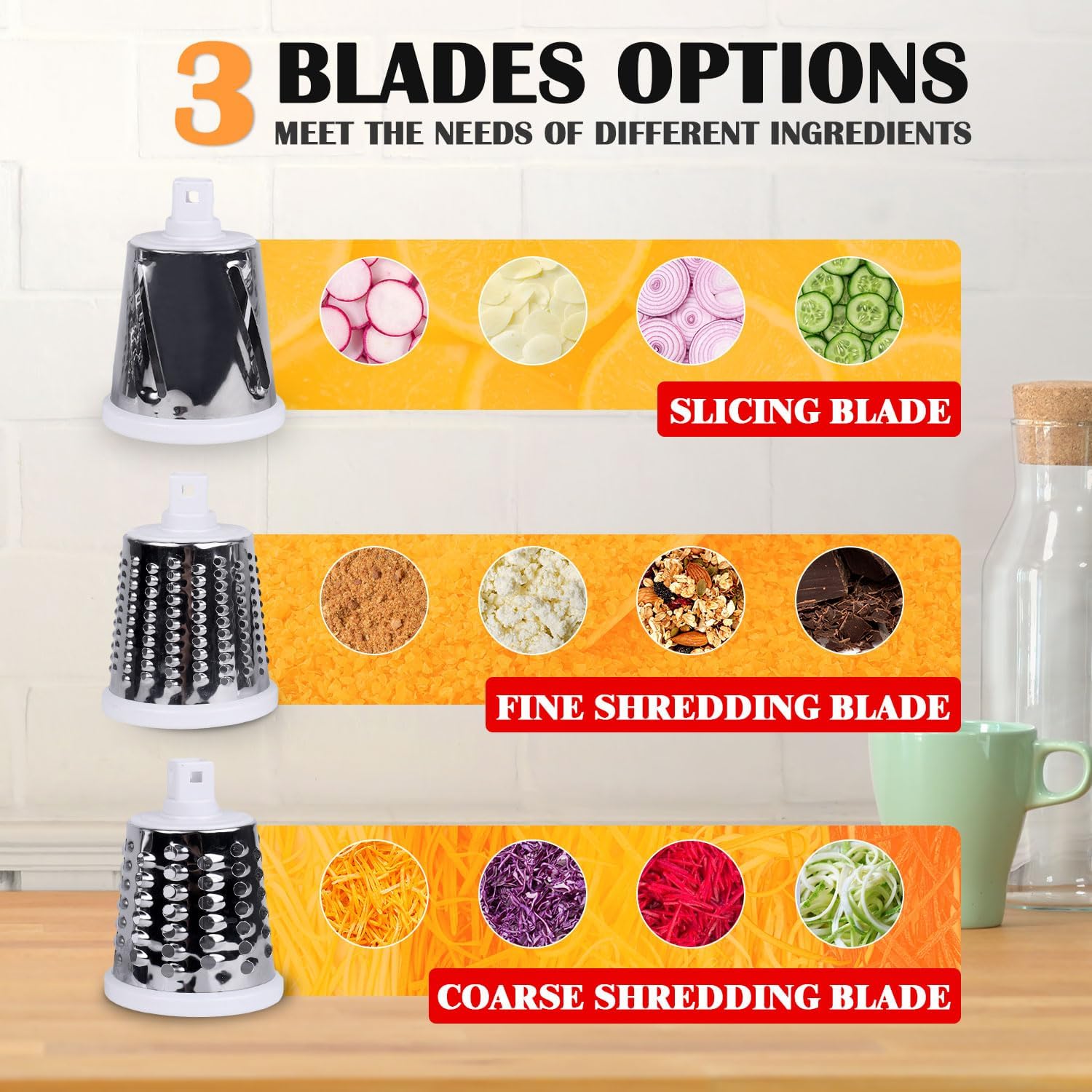 - 【Free Your Hands】Rotary cheese grater has 3 different blades for slicing, coarse and fine cuts, perfect for cheese, potatoes, carrots, nuts, peanuts, etc., to meet your different needs for food,an indispensable tool in the kitchen.