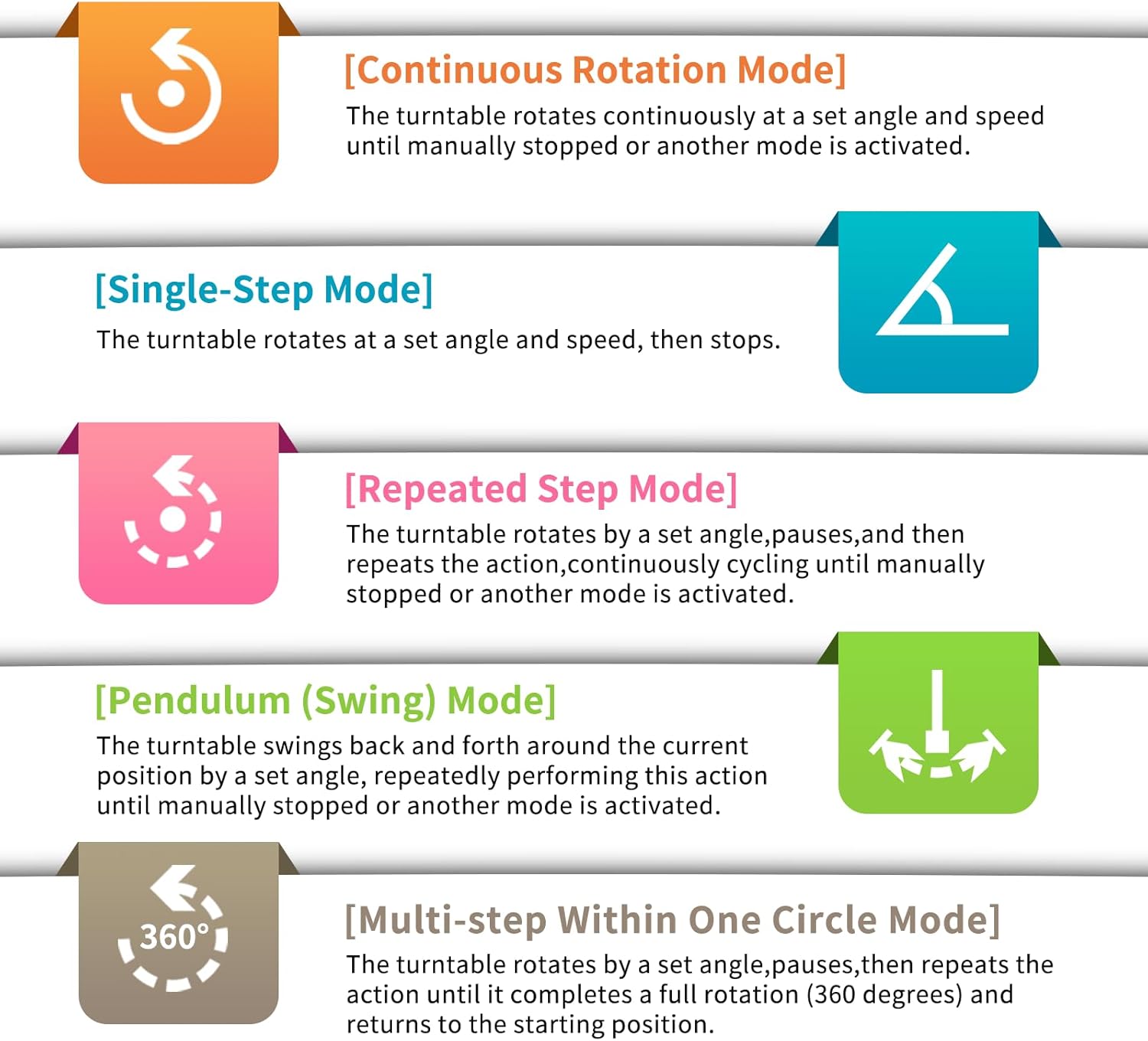 - 【The motorized turntable Supports five rotation modes】: 【Continuous Rotation Mode】for Live Video Show.【Single-Step Mode】for Product Display and Live Demonstration.【Repeated Step Mode】 for Automated Product Display .【Multi-step Within One Circle Mode】for 360-Degree Multi-Angle Photography and 3D Scanning. 【Pendulum (Swing) Mode】 for Automatic Multi-Angle Front-and-Back Product Display. The intelligent multi-step within one circle mode makes shooting more streamlined and automated