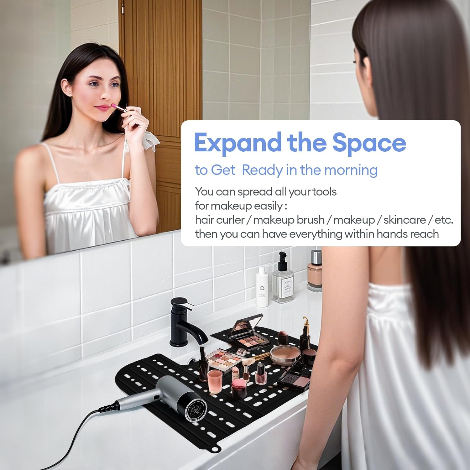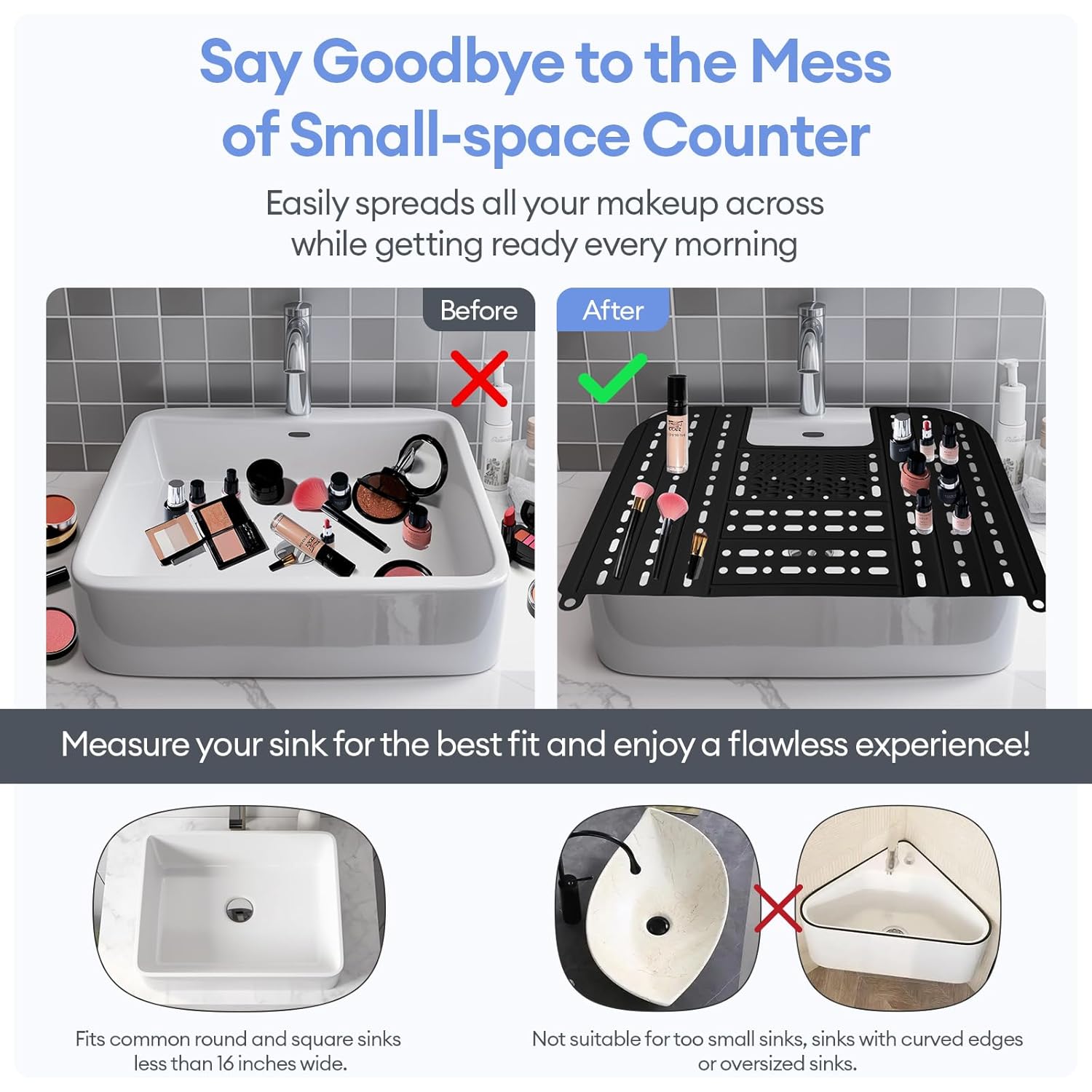- Maximize bathroom sink space: This bathroom sink cover fits most sinks and can extend your countertop. It allows you to easily store makeup tools, such as curling irons, makeup brushes, makeup, skincare products, etc. and prevents brushes and other cosmetics from falling into the sink.