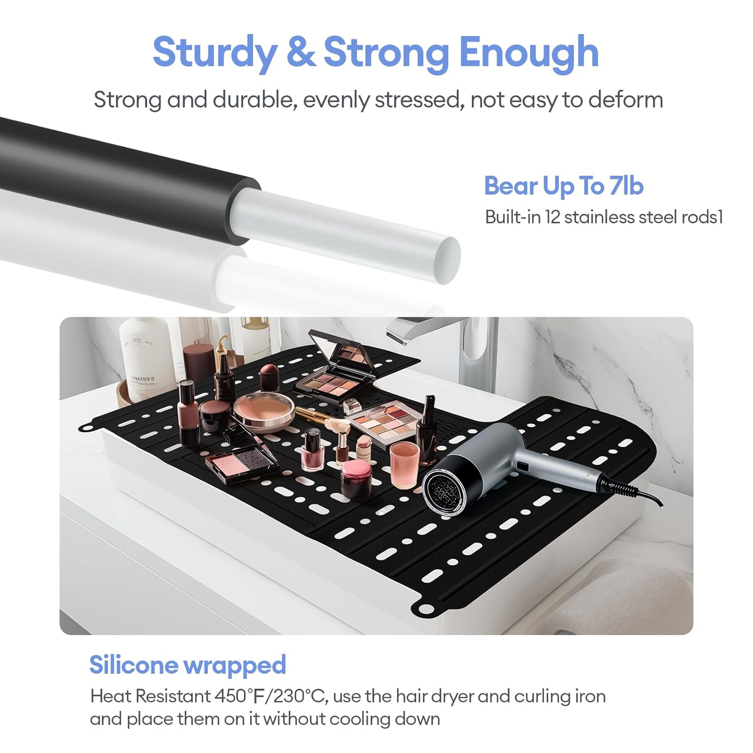 - Sturdy and durable: The sink cover for counter space is made of soft heat-resistant silicone and can withstand temperatures up to 480Β°F. There is no need to worry about hair dryers, curling irons, and other heating tools scalding the desktop; there is a steel rod running through the silicone, which is high temperature resistant and has a high load-bearing capacity. It is not easy to collapse and can bear up to 7 pounds.