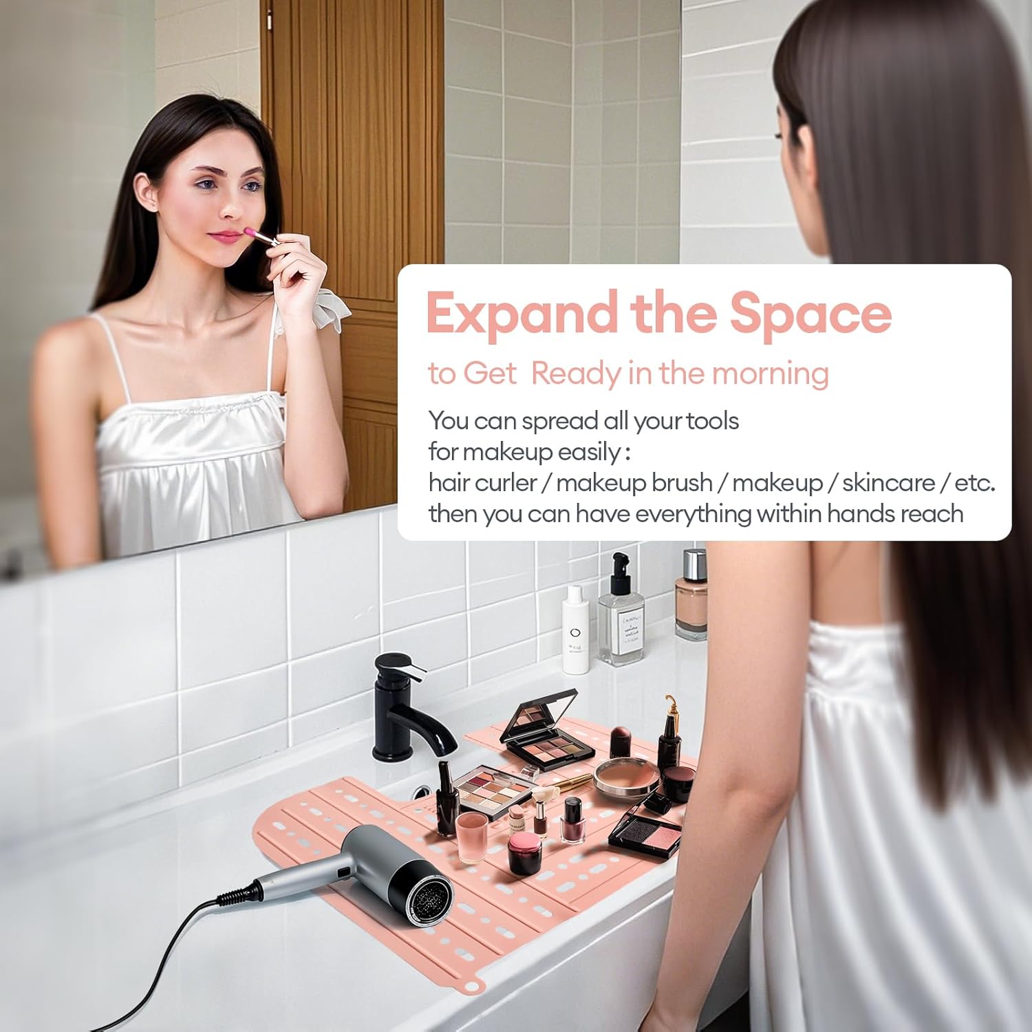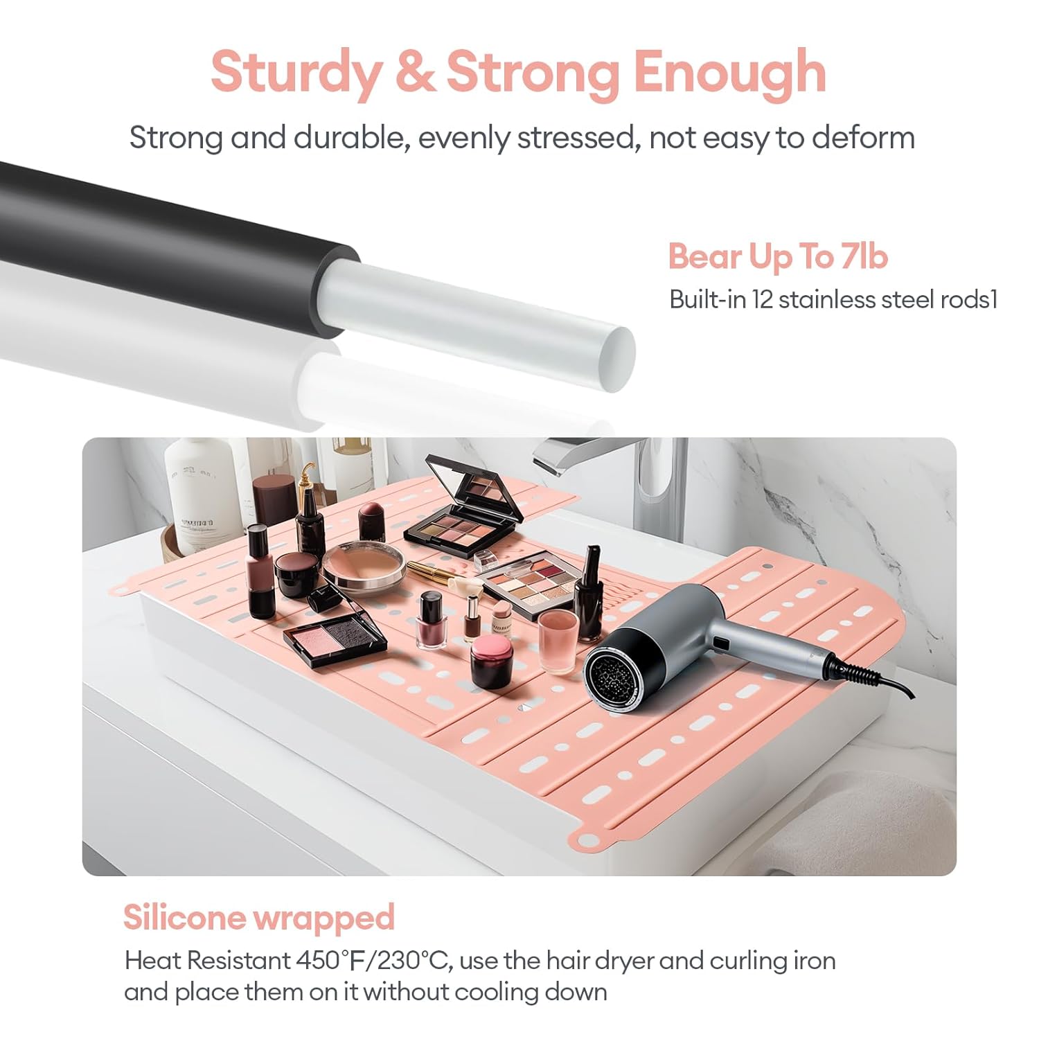 - Sturdy and durable: The sink cover for counter space is made of soft heat-resistant silicone and can withstand temperatures up to 480Β°F. There is no need to worry about hair dryers, curling irons, and other heating tools scalding the desktop; there is a steel rod running through the silicone, which is high temperature resistant and has a high load-bearing capacity. It is not easy to collapse and can bear up to 7 pounds.