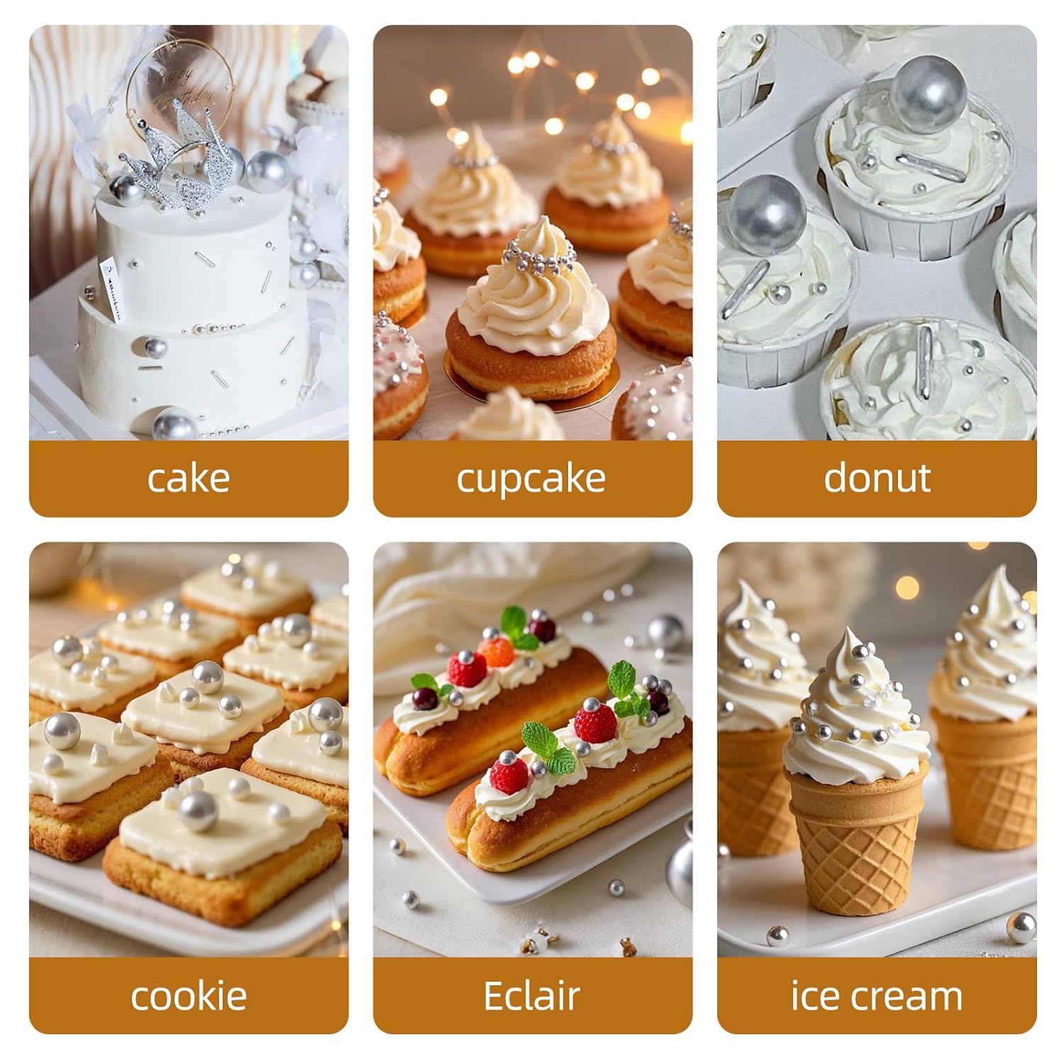 - Versatile Dessert Decoration: Our sprinkles includes different sizes of Silver beads and rods, perfect for meeting all your baking decoration needs.The sugar decorations are edibled candies. It is normal for large candies to have a hard texture and can be eaten with confidence.After baking, decorate the cookies or cake with pearl sugar to avoid melting