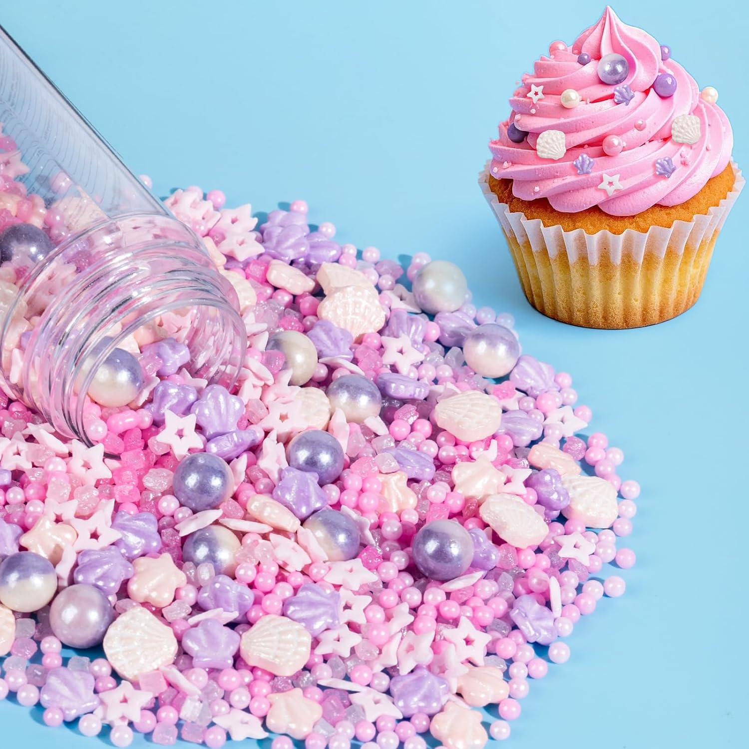 Edible Seashell Sprinkles Cake Decorating,130g/4.58oz,Pink Purple Pearl Sugar Sprinkle,Mix Sea Beach Stars Shell Sprinkles, Ocean Theme Baking Candy Decorations,Cupcake,Ice Cream Cookie Donuts Toppings,Birthday Children's Summer Party Supplies