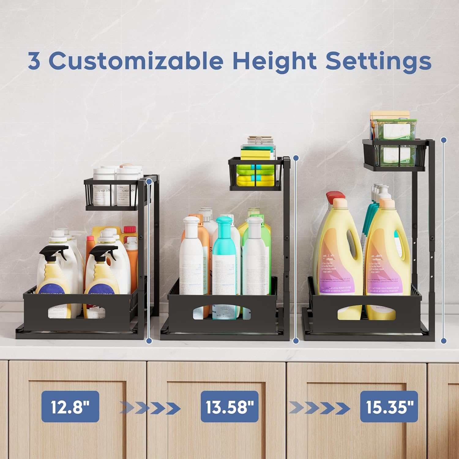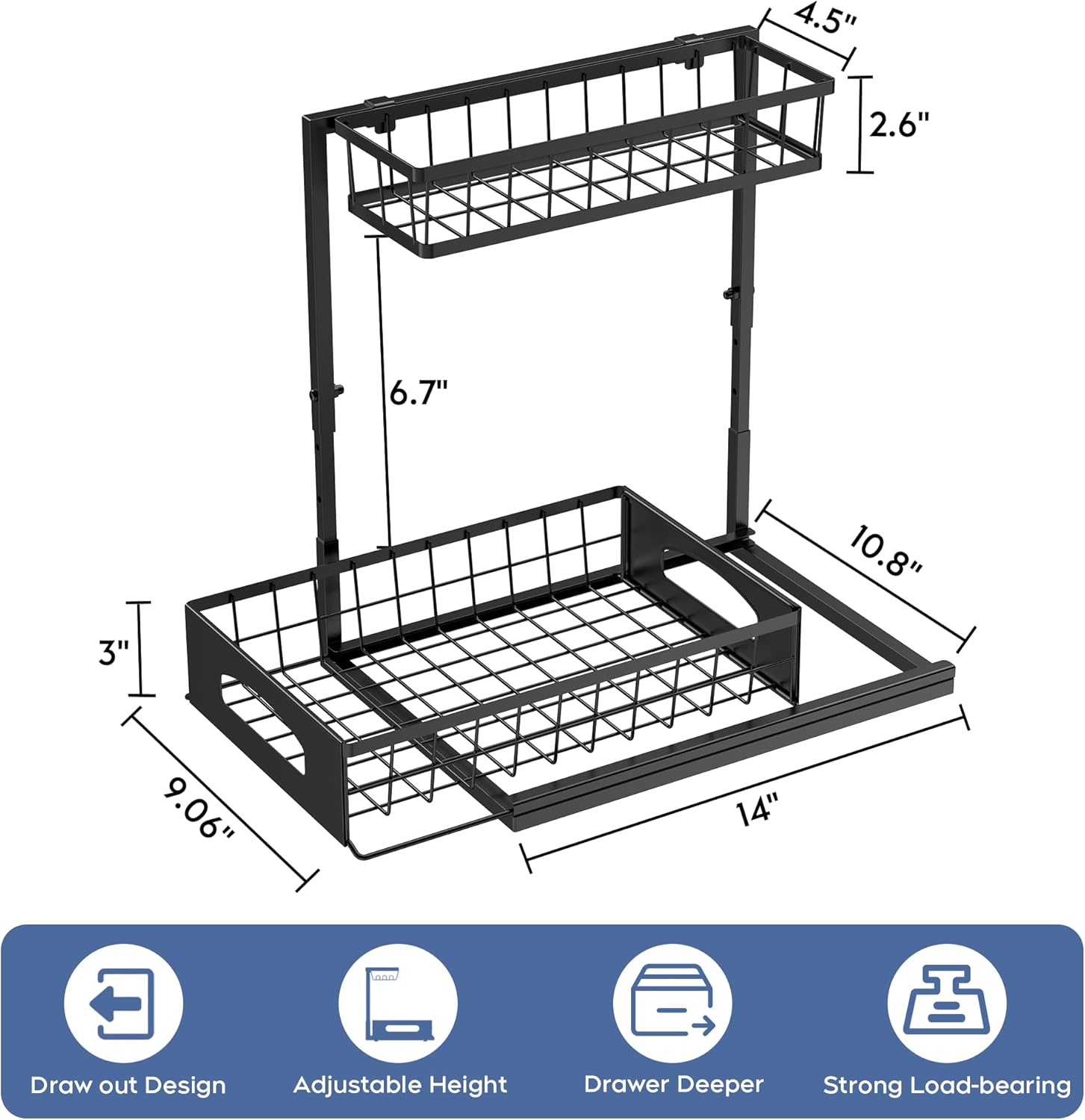 - DIMENSIONS & LOAD CAPACITY: This 2-tier cabinet storage shelf measures L14" x W10.8" x H12.8" (height adjustable up to 15.4"), with a lower drawer size of L14" x W9.1" x H3" and a top basket size of L13" x W4.5" x H2.7". Engineered to withstand 50 lbs.