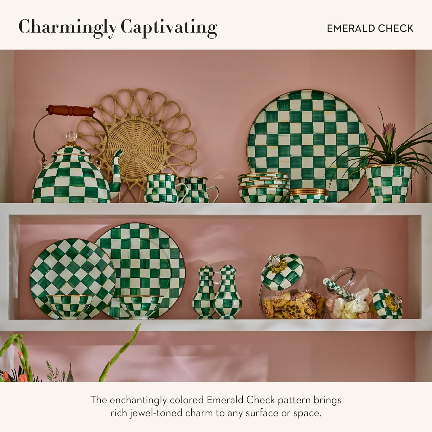 - ENTERTAINING ESSENTIAL: Serving dishes for entertaining don’t get any more charming than this. Our Emerald Check food platter features a hand-painted green-and-white checkered pattern, a heavy-gauge steel underbody, and a bronzed stainless-steel rim.