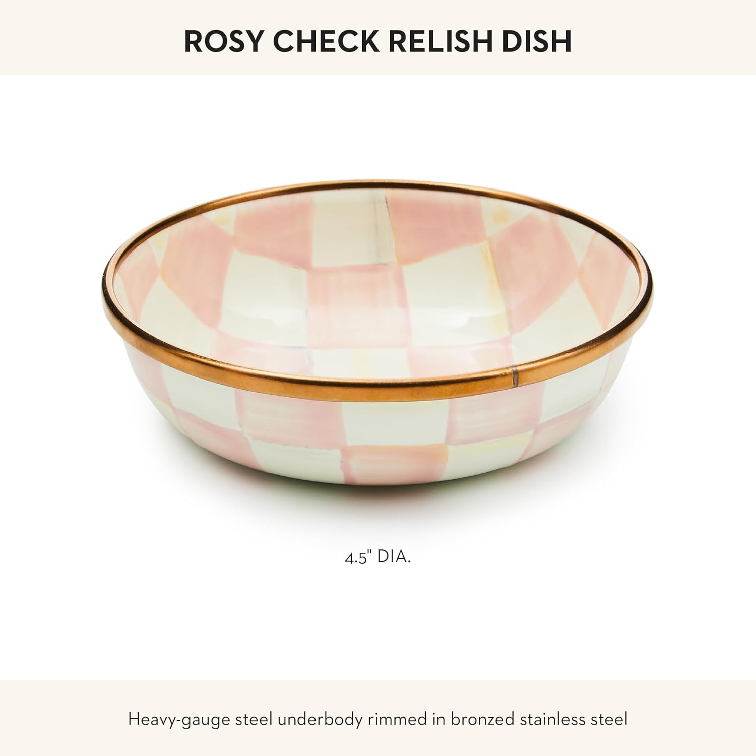 - ENTERTAINING ESSENTIAL: Elevate your serving dishes for every single snack or meal with our Rosy Check small bowl for relish. It features hand-painted, color-dragged pink-and-white checks on enameled steel and has a bronzed stainless-steel rim.