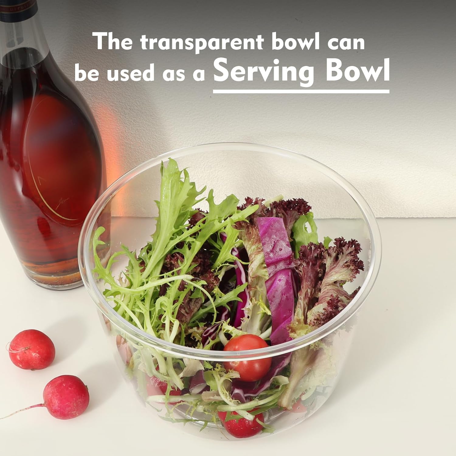 - Multi-functional design: The transparent bowl doubles as a serving bowl, letting you go straight from spinning to serving your salad without transferring to another container. The inner strainer basket can also be used as a colander, making it a versatile tool for rinsing and draining fruits, vegetables, or macaroni