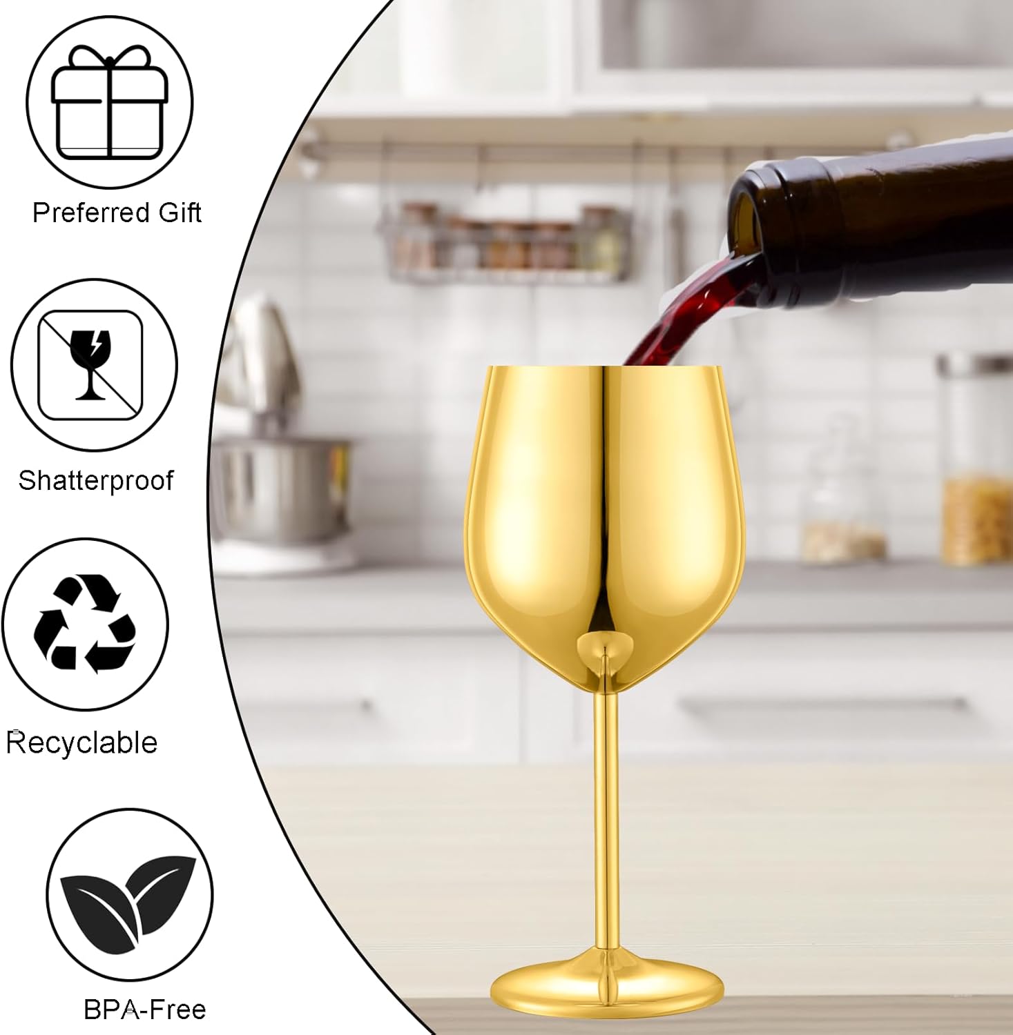 - Elegant Design - Expertly hand-polished to perfection, these stainless steel wine glasses feature a luxurious electroplated finish with a sophisticated metallic sheen. The large capacity 18 ounces capacity and weighted flat base provide exceptional stability, while the graceful long stem enhances both visual elegance and practical functionality - allowing you to swirl your wine with confidence to fully release its aromatic bouquet