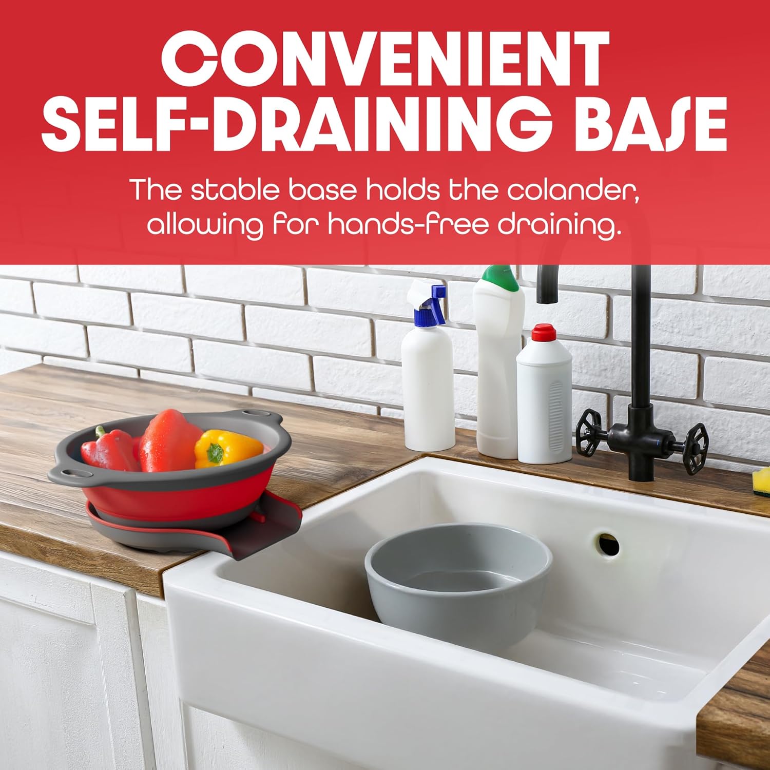 Strainer with Self-Draining Base (5QT) Over-Sink Collapsible Kitchen Colander Set with Side-drain Base for Pasta Vegetables and Fruit, XL Large Capacity, Dishwasher Safe (5-Quart) Red/Gray
