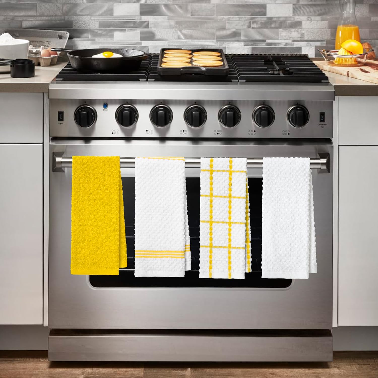 - VALUE PACK: Collection includes 4 cotton kitchen towels available in a variety of colors to coordinate with any kitchen dรฉcor. Measures 15 in x 25 in.