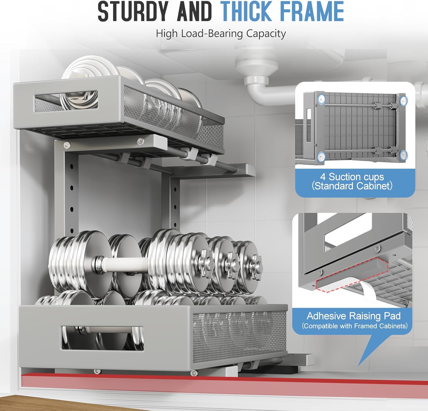 - 【2-Tier Pull-Out Design for Easy Access】This under-sink organizer features a double-layer pull-out design, allowing you to easily access items at the deepest part. The upgraded, thickened iron circular sliding rails ensure a smooth and seamless pulling experience, making each use effortless. The unique pull-out locking mechanism effectively prevents the drawers from being completely pulled out, avoiding the risk of items falling or structural damage caused by over-pulling, ensuring safer and more convenient use.