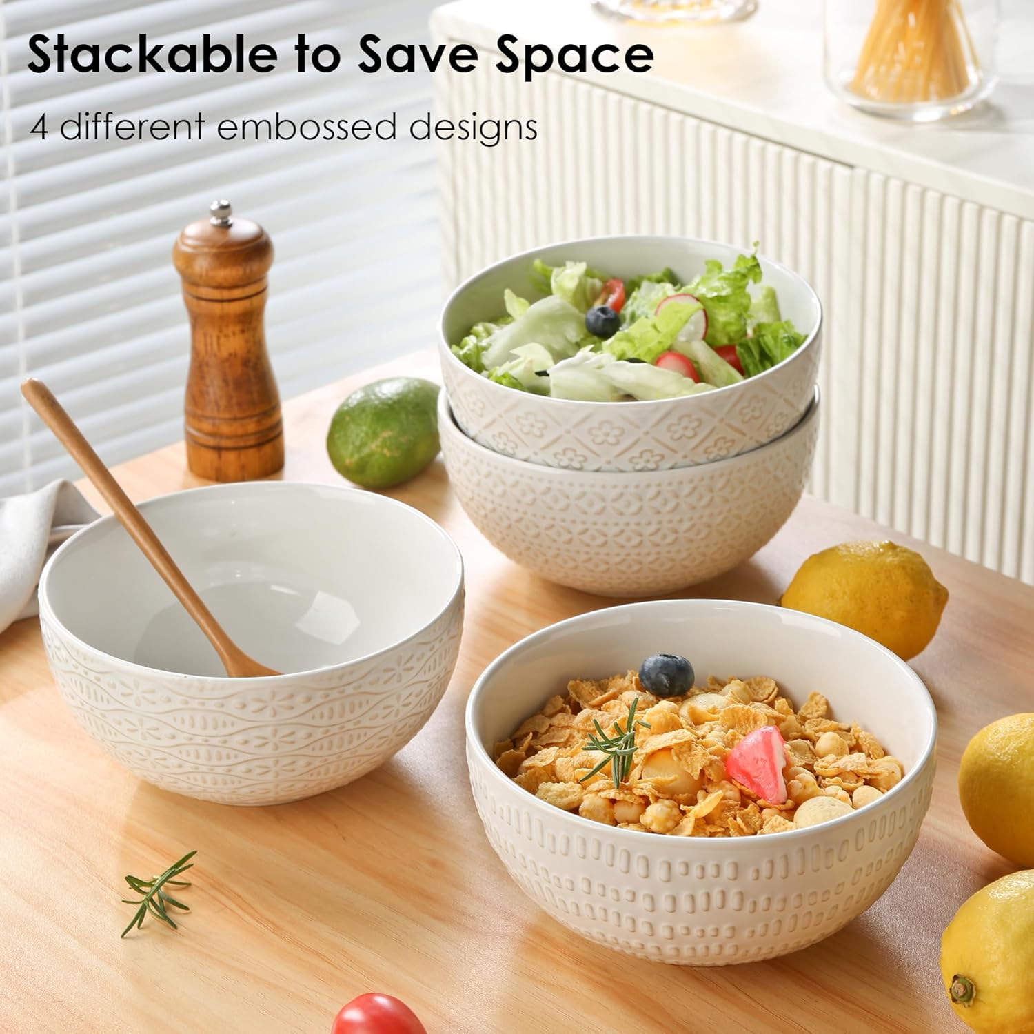 40 OZ Large Cereal Bowls Set of 4, Farmhouse Embossment Ceramic Salad Bowls for Soup, Serving, Fruit, Snack, Noodle, Ramen, Pho, Microwave & Dishwasher Safe, 6.7 Inch White