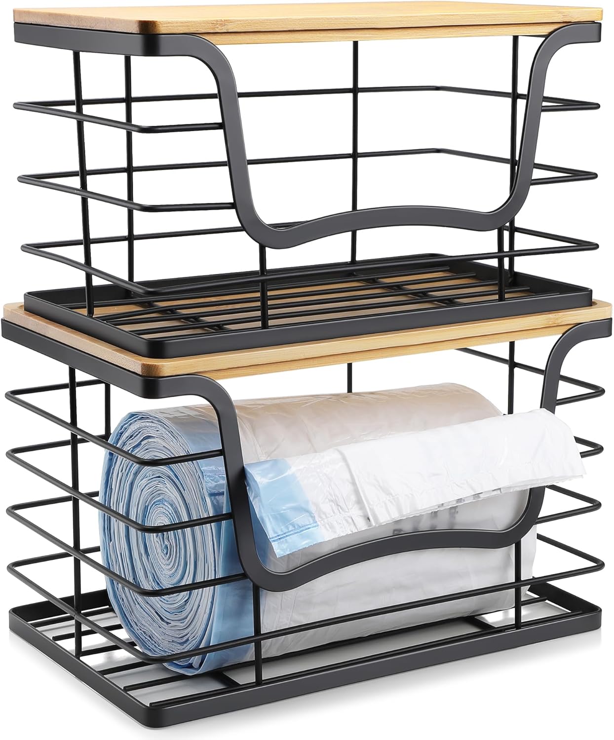 Trash Bag Dispenser Holder for Kitchen 2 Pack Laundry Room Trash Bag Holder Wall Mount Garbage Bag Dispenser Stackable Roll Holder with Bamboo Top for Countertop, Under Sink