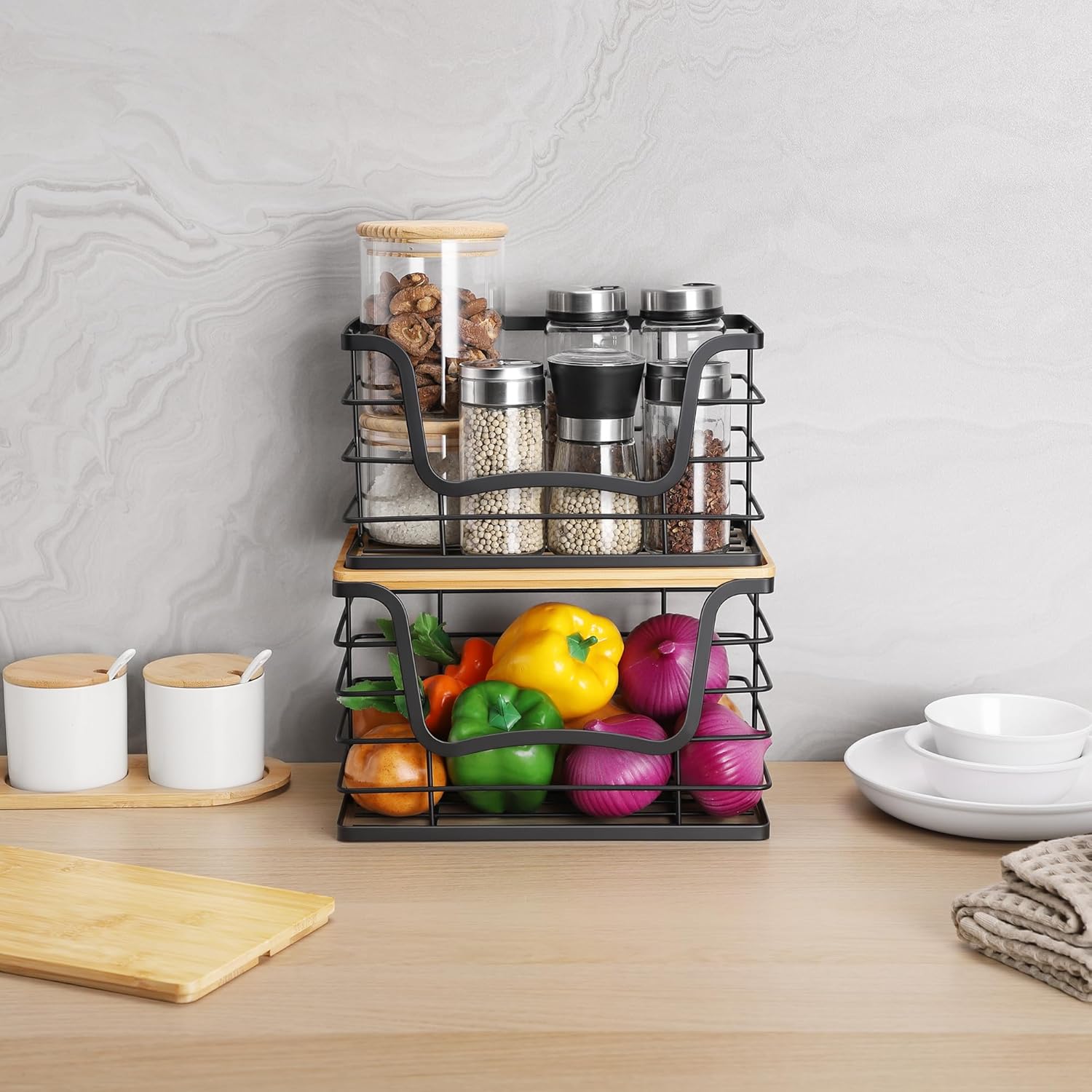 - Easy to Use & Install: Both dispensers feature a large opening for quick trash bag retrieval and a narrow base to prevent sliding. The bamboo tops on both sizes double as shelves for extra storage, enhancing kitchen storage & organization. The large dispenser’s bamboo top includes an anti-slip groove for added functionality