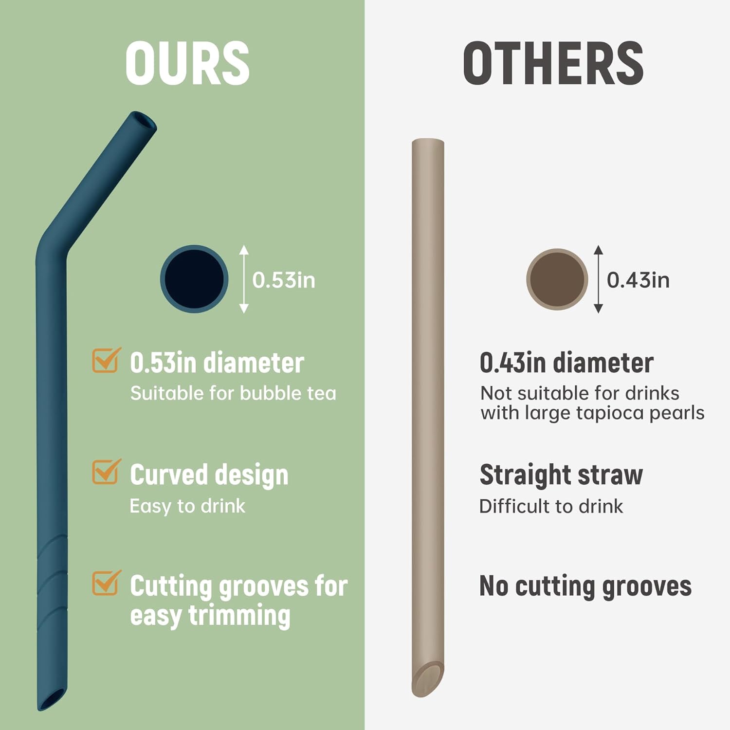 - Perfect For Thick Beverages: Say goodbye to struggling with boba pearls or smoothies. These reusable silicone straws feature a widened inner diameter (0.39 inches) that effortlessly handles chunky toppings and viscous drinks.